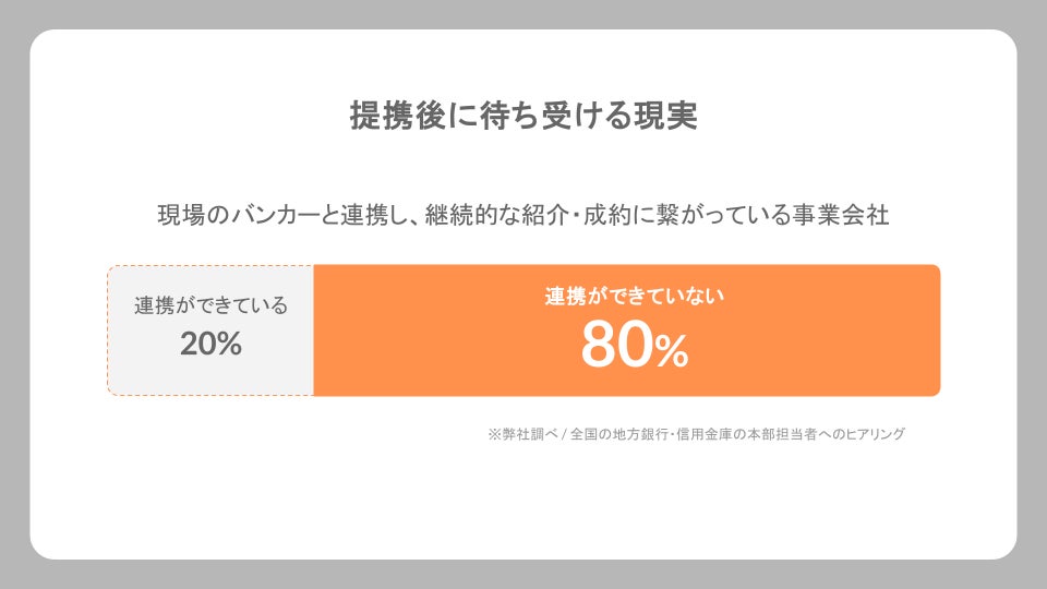 事業会社と地域金融機関とのアライアンスにおいて、約70〜80%が具体的な企業紹介(継続的な連携)に至らず、提携が形骸化しているという実態があります。(当社調べ)。