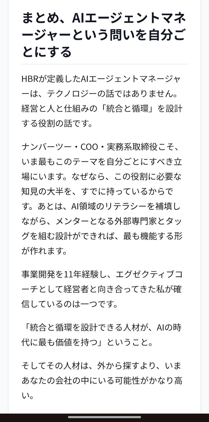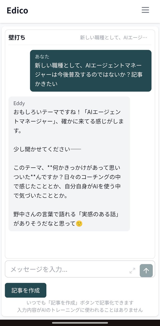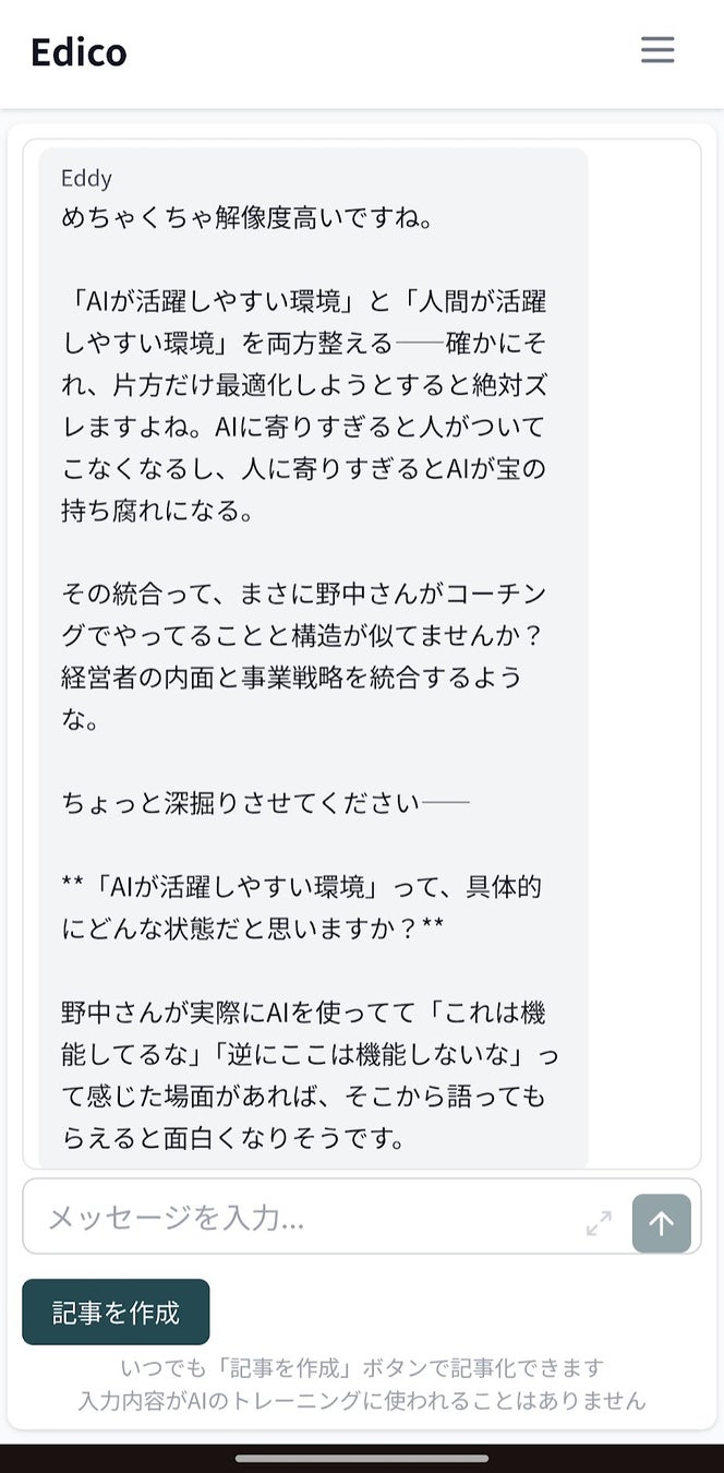 私は経営者向けのエグゼクティブコーチとして、Edicoの開発とマーケティングの両面で経営支援に参画しています。また、自分自身もこの3年間で100万文字以上の文章を書き、生成AIを活用したライティングを数多く試してきました。その立場から見ても、Edicoの壁打ち体験と記事生成精度には、強い可能性を感じています。