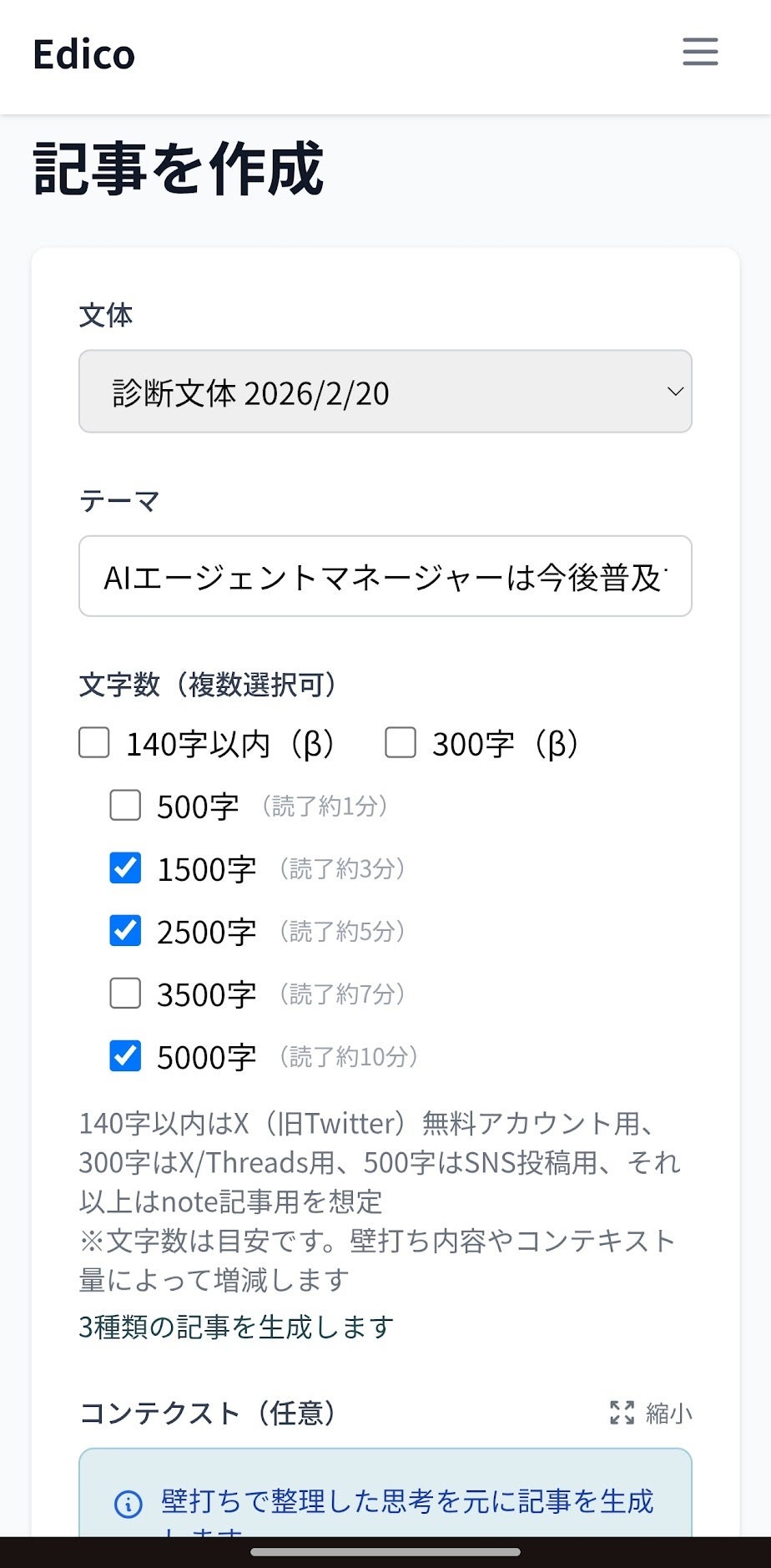 主な機能:AI編集者との壁打ち/構成設計/文体再現/発信先や文字数に応じた記事作成