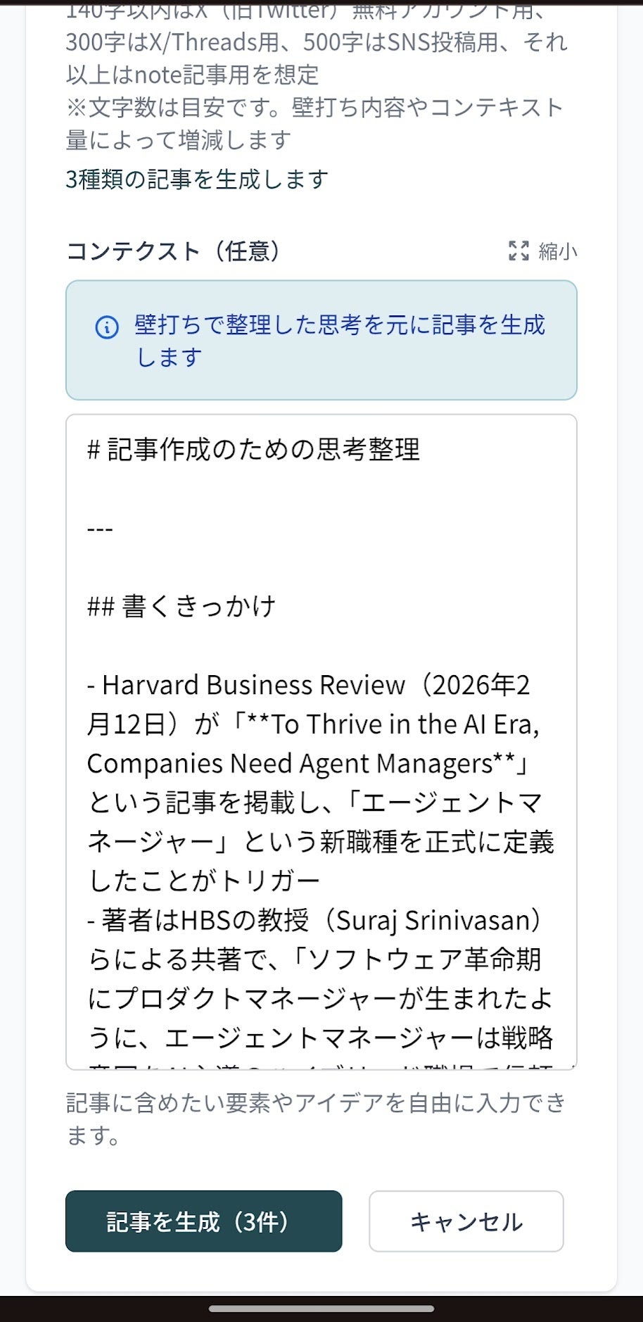 1回の壁打ち内容をもとに、note・X・Threads・Wantedly・ブログ等での発信を想定しながら、文字数や用途に応じた複数パターンの記事を作成できます。長文記事は、noteやブログに加え、メルマガや、Wantedlyストーリー等での活用も想定しています。