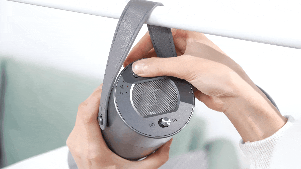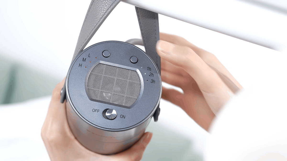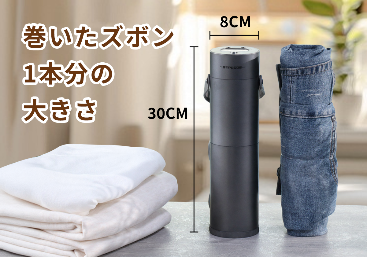 本体は直径8cm×高さ30cmの円柱型、重量わずか約850g。巻いたズボン1本分の体積で、付属の収納袋にすべてのパーツが収まり、吊り下げ用ベルト付きで、どこでも簡単に掛けられます。内蔵電池なしなので、飛行機の手荷物としても携帯可能な、真のポータブル設計です。