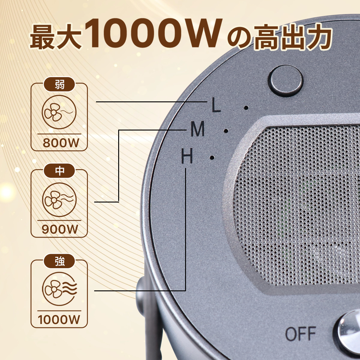 高密度ニクロム合金発熱体を採用し、最大1000Wの高出力で迅速に温風を発生。3段階の風量(強・中・弱)から選択可能で、衣類の素材と量に合わせて最適な乾燥が行えます。吹き出し口温度は最大85℃に達します。