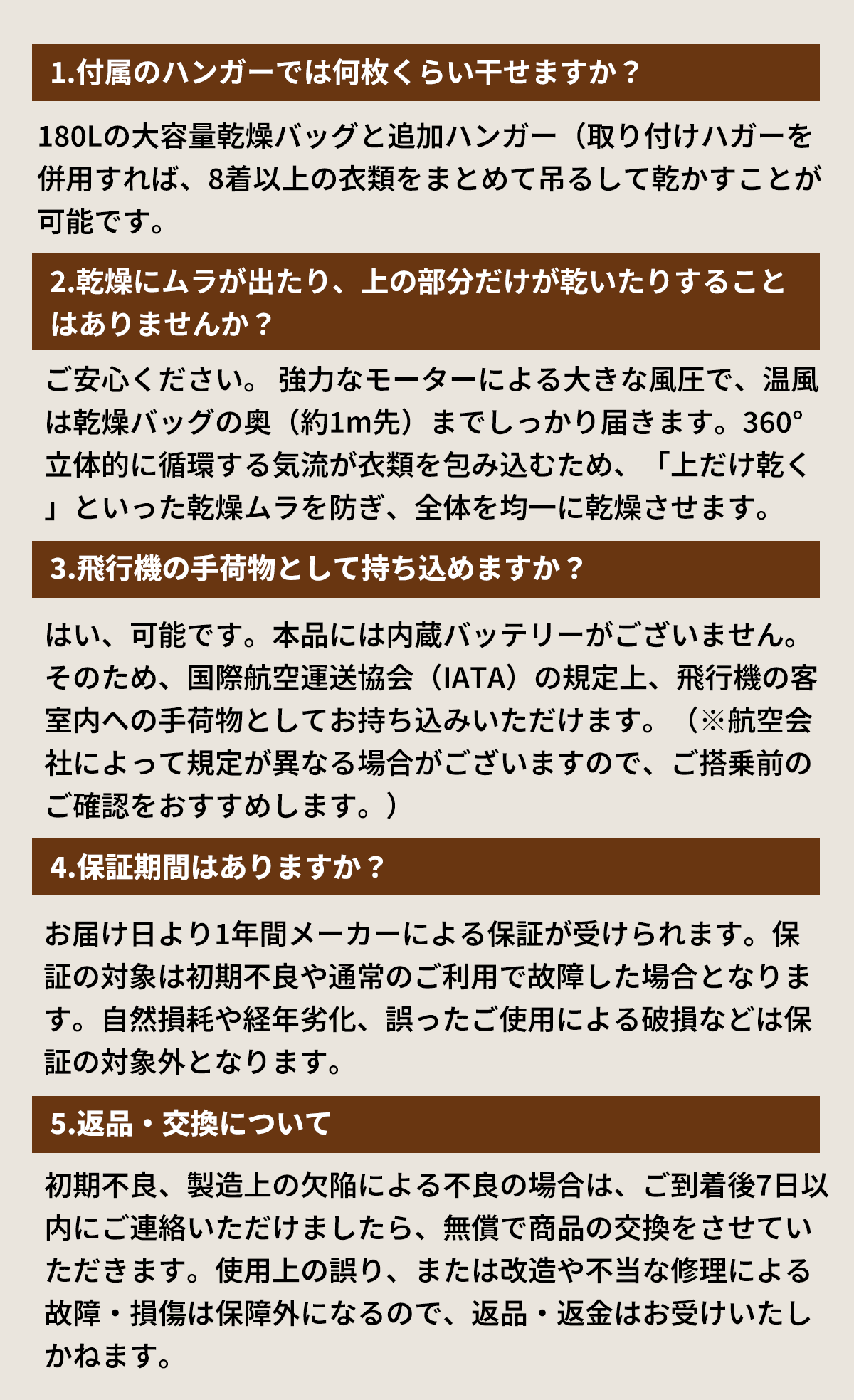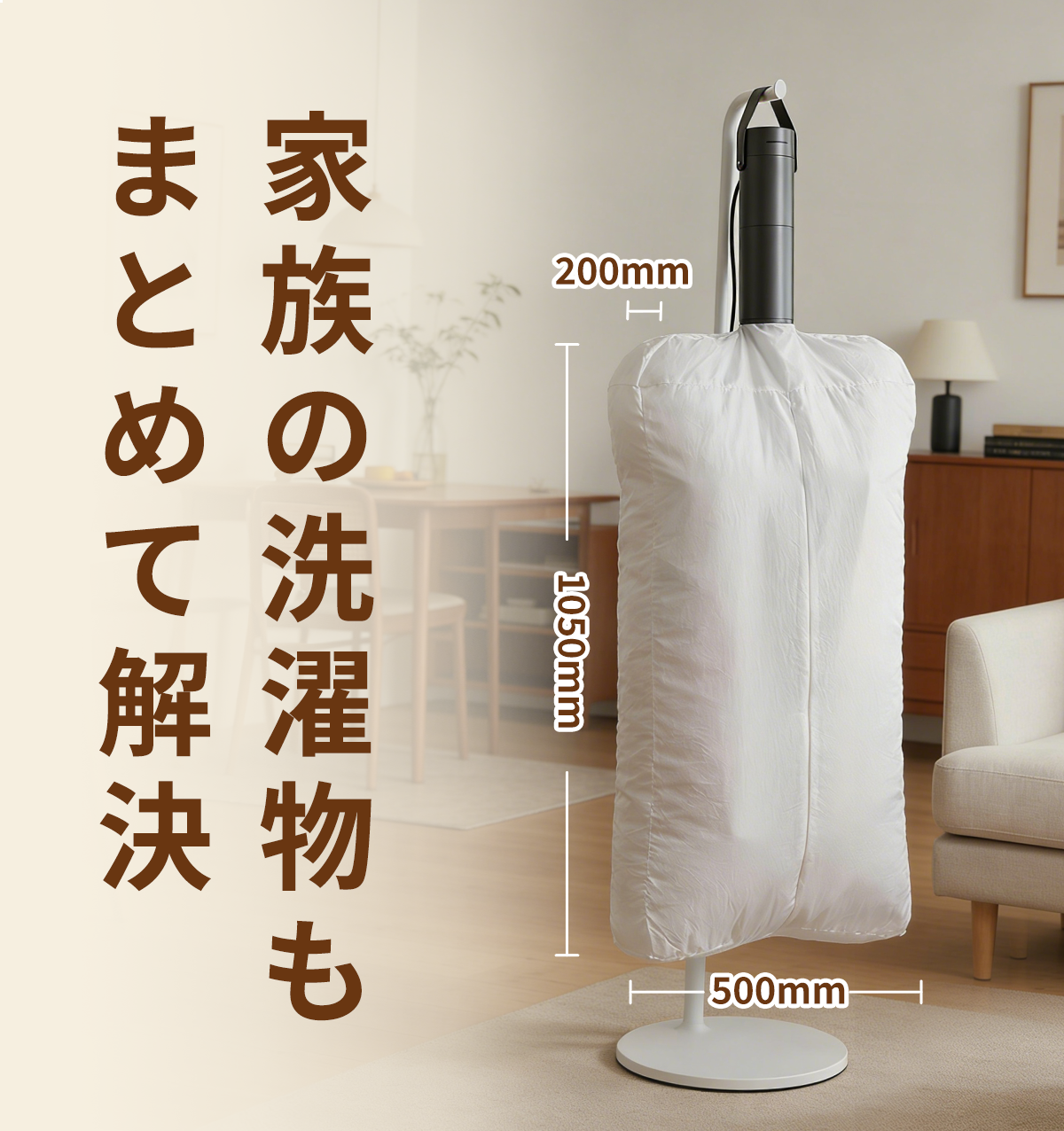 高密度ポリエステル製の専用乾燥バッグは、180Lの大容量を実現。延長設計で排気口が塞がりにくく、ファスナー式で出し入れも簡単です。付属のハンガーで、7着以上の衣類を吊るして乾かせます。家族の毎日の洗濯物をまとめて乾燥可能。少量からまとめ洗いまで、あらゆるニーズに対応します。