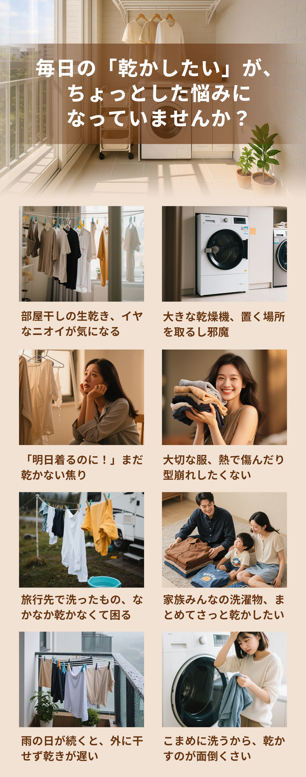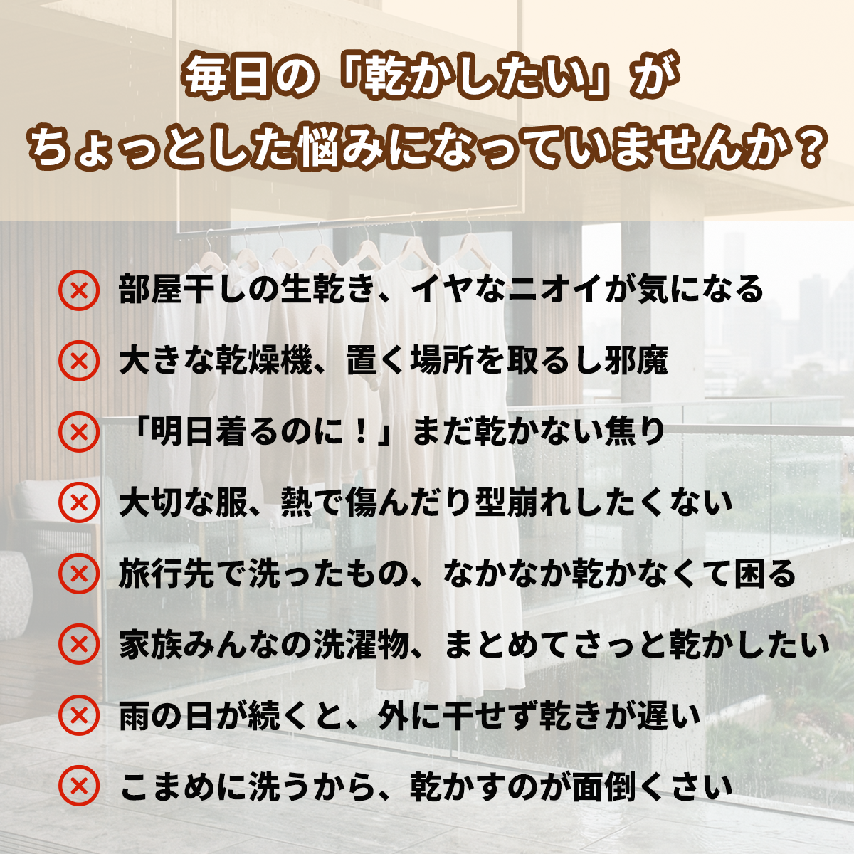 そのコンパクトさと強力な乾燥力で、マンションの室内干しはもちろん、出張先のホテル、キャンピングカー、学生寮など、あらゆる生活スタイルと場所で、洗濯物の「乾かない」悩みを解決します。