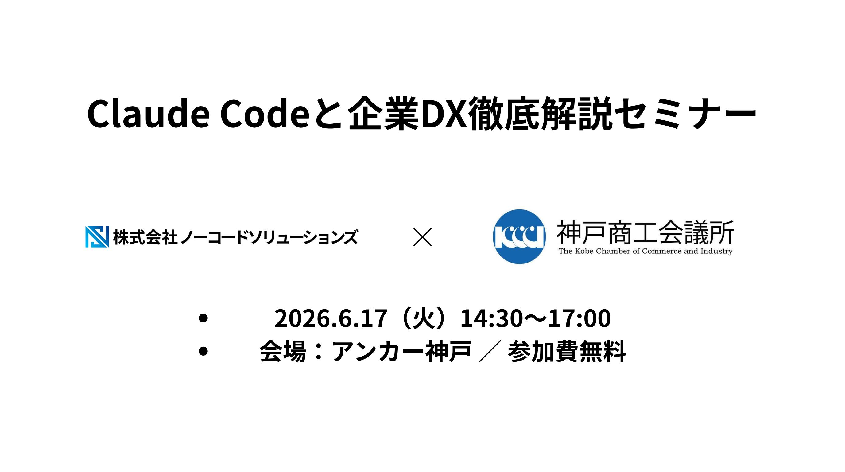 株式会社ノーコードソリューションズ(本社:京都市下京区、代表取締役社長:仙入功樹)は、神戸商工会議所と連携し、2026年6月17日(水)にAIエージェント型ツール「Claude Code」の活用セミナーを開催いたします。