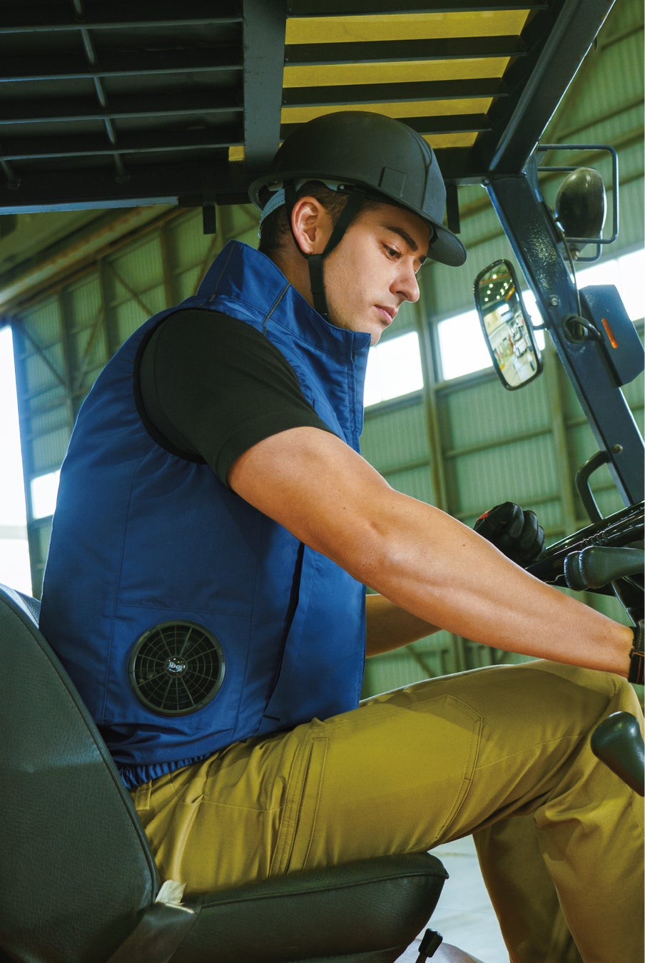 ファンで服の中に外気を取り込み、汗が蒸発する際の気化熱で、着用者の身体を直接冷却する製品です。広大な倉庫や屋外など空調設備が効かない場所でも、冷却効果を得ることが可能です。