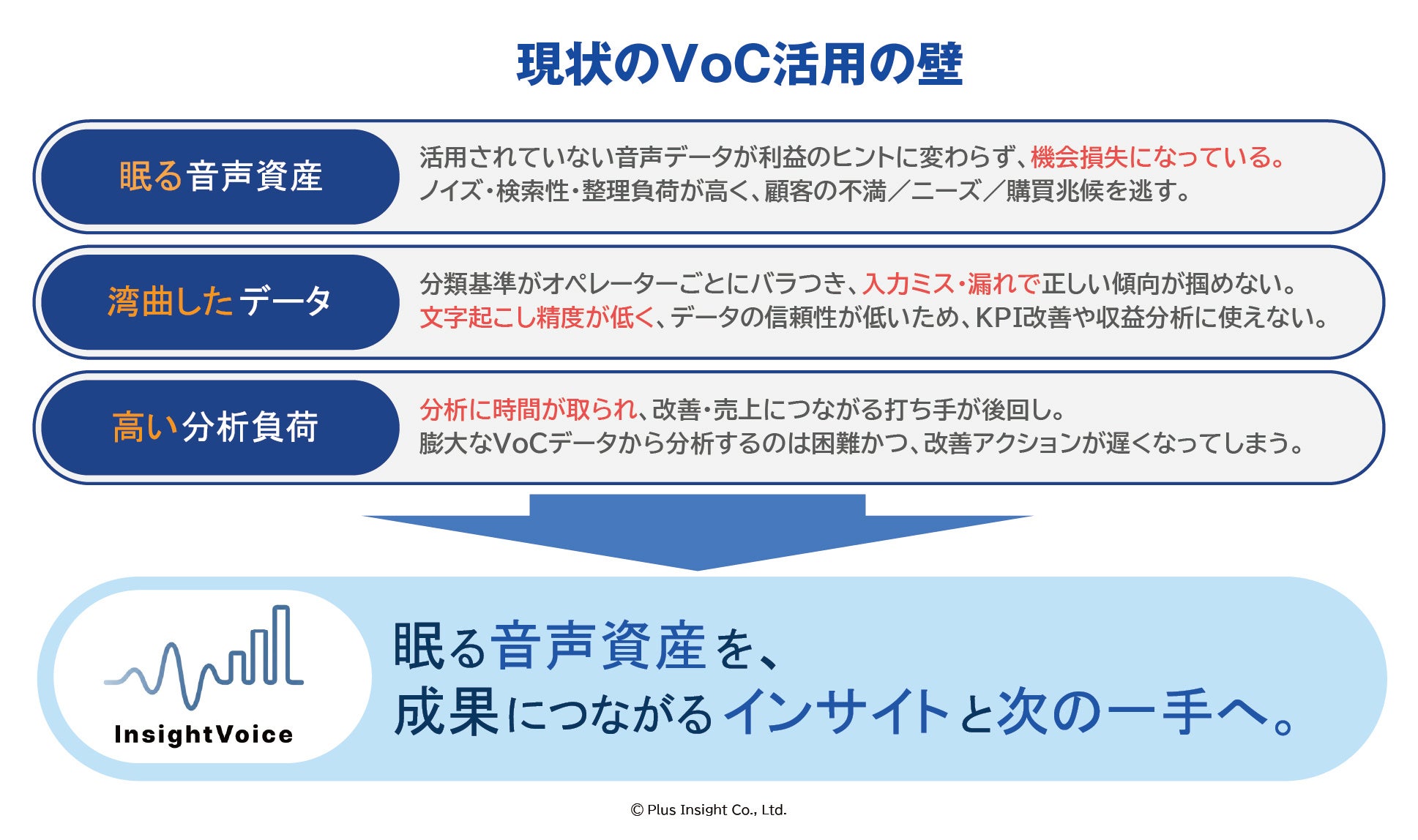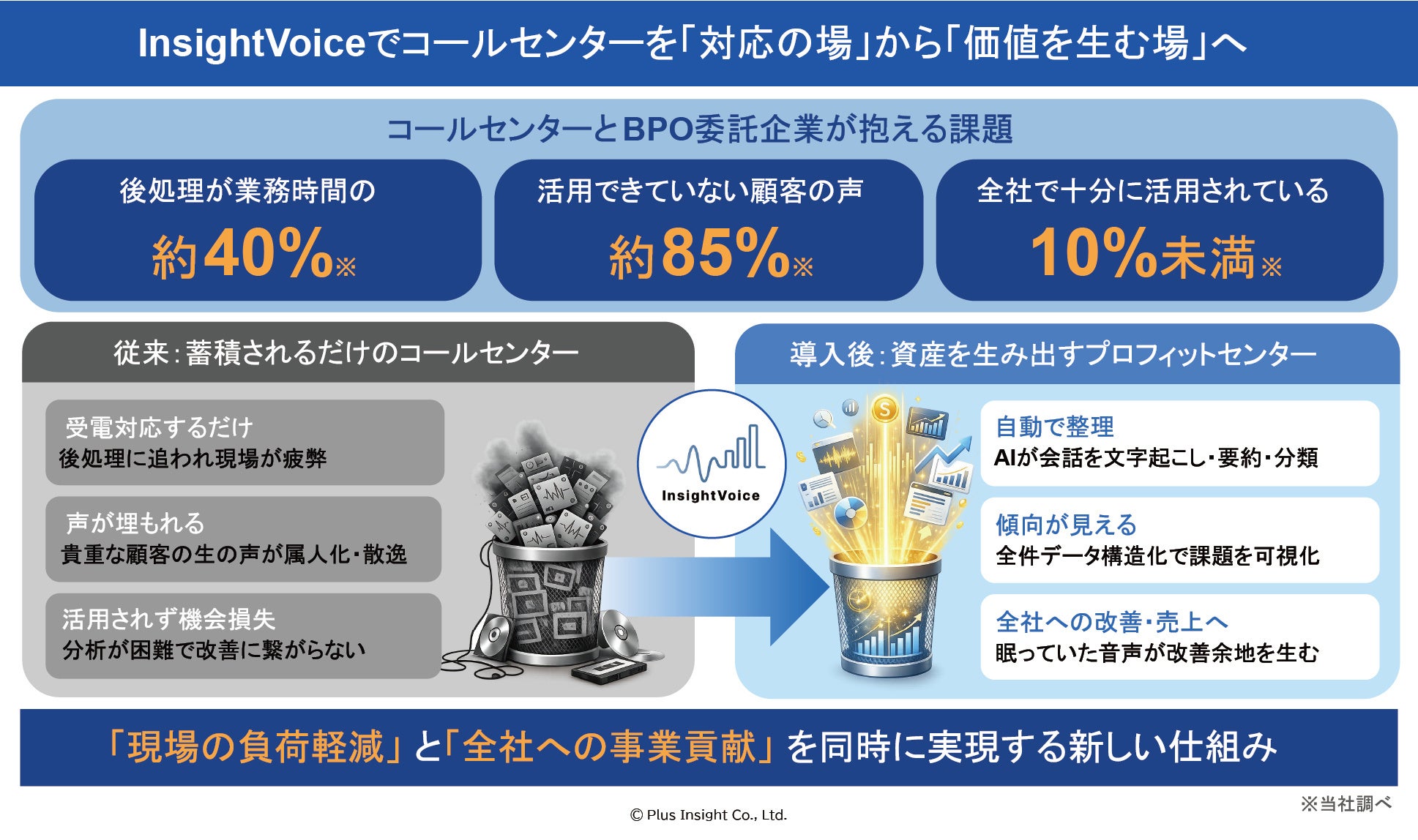 Plus Insight株式会社(本社:東京都、代表者:小川)は、2026年開催の「Startup JAPAN EXPO」において、コールセンター音声をAIで分析し、業務改善アクションまで自動生成するVoC分析サービス「InsightVoice(インサイトボイス)」を出展いたします。