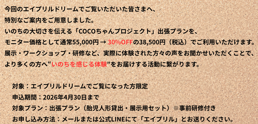 COCOちゃんプロジェクトは、胎児人形を通して「いのちを感じることの大切さ」を伝える活動です。
