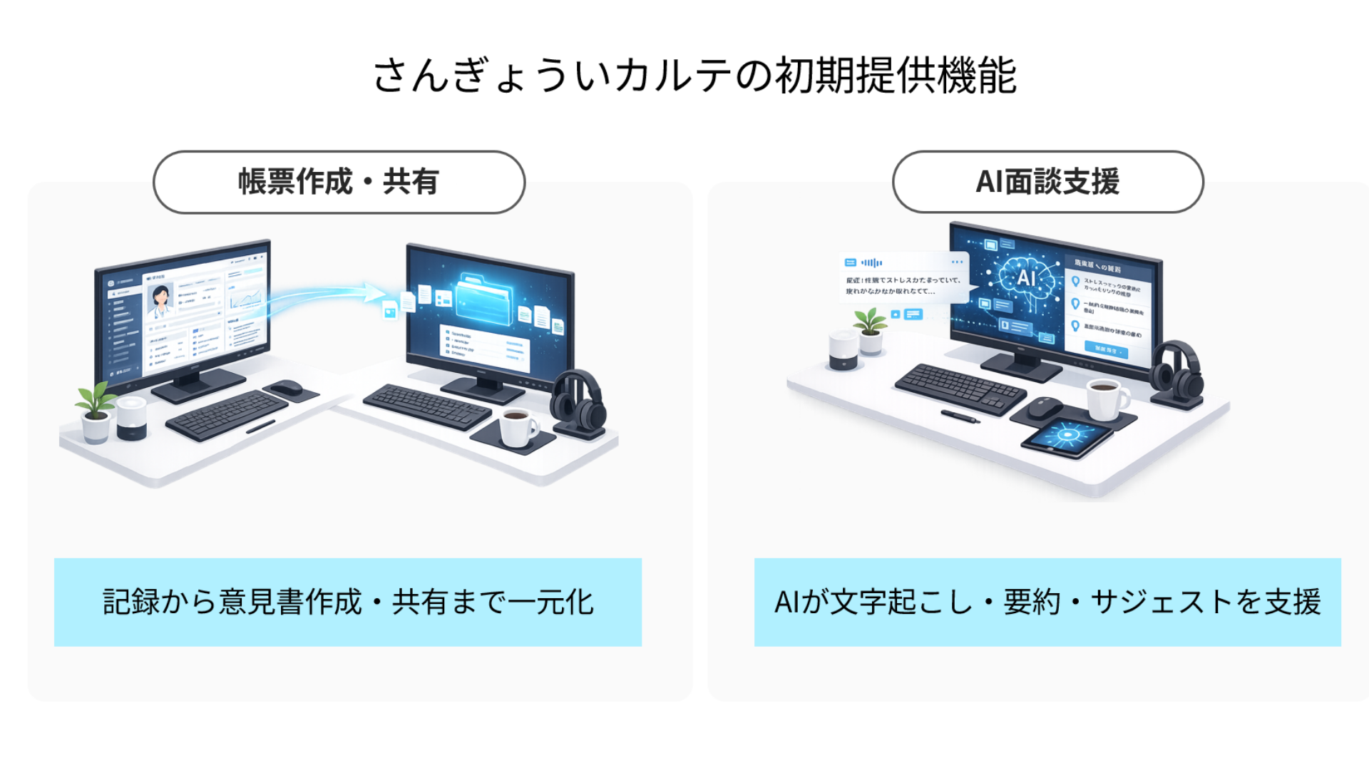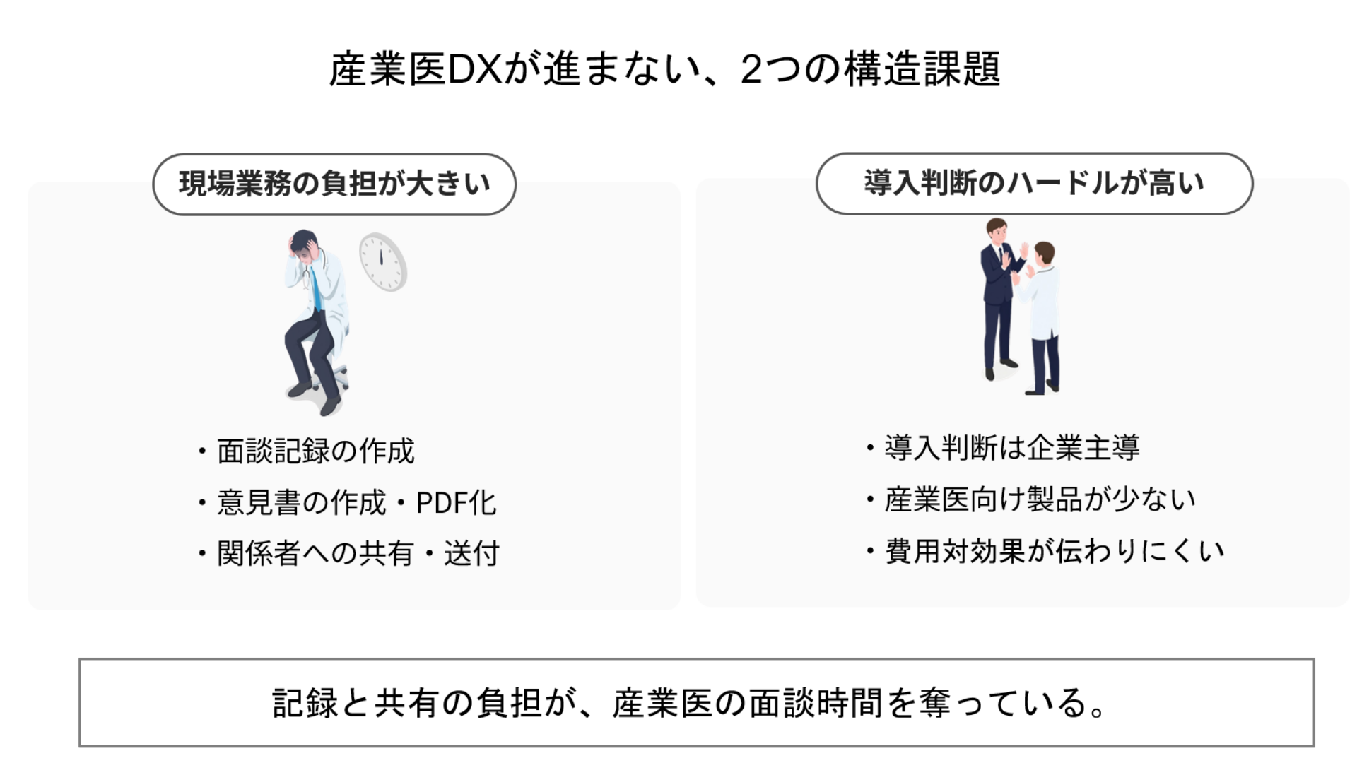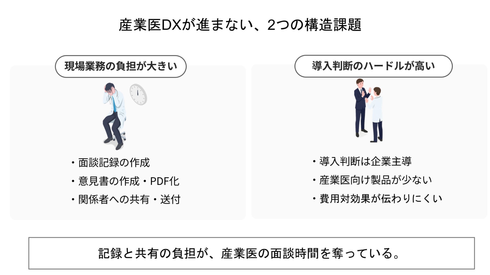 産業医業務の現場では、面談そのものだけでなく、その後に発生する記録作成、意見書作成、関係者への共有といった周辺業務に多くの時間と負担がかかっています。私たちは、こうした実務の積み重ねが、産業医が本来向き合うべき従業員支援や判断業務の時間を圧迫していると考えています。