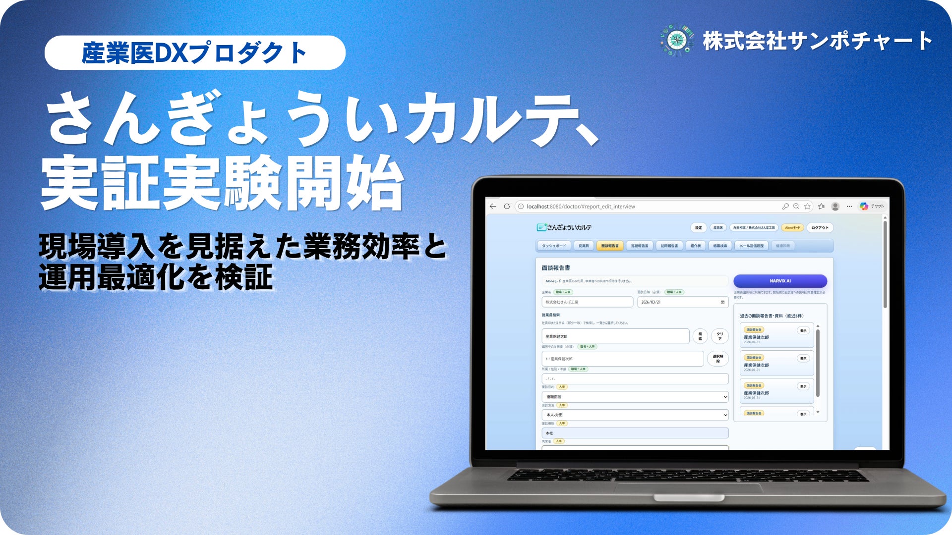 株式会社サンポチャート(本社:愛知県名古屋市、代表取締役:角田拓実)は、産業医業務における面談記録の作成、意見書作成、関係者への共有といった一連の業務を一元化する産業医向けDXプロダクト「さんぎょういカルテ」について、実際の企業現場での運用性と実用性を検証する実証実験(PoC)を開始しました。