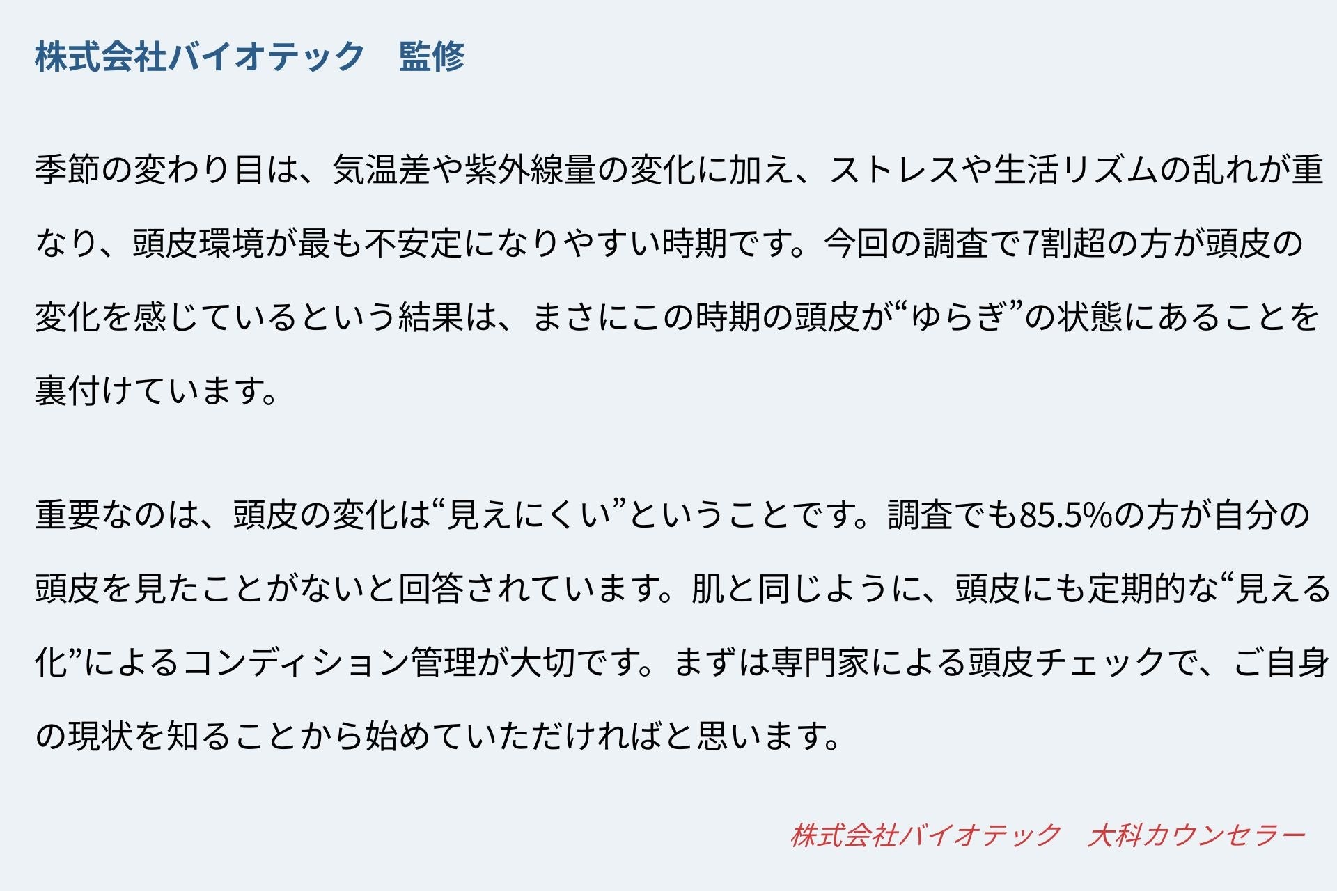 大切なのは、まず「自分の頭皮を知る」こと。株式会社バイオテックでは、最新のマイクロスコープを用いた無料の頭皮チェック&カウンセリングを全国のサロンで実施しております。季節の変わり目を機に、ぜひ一度ご自身の頭皮コンディションを確認してみてはいかがでしょうか。