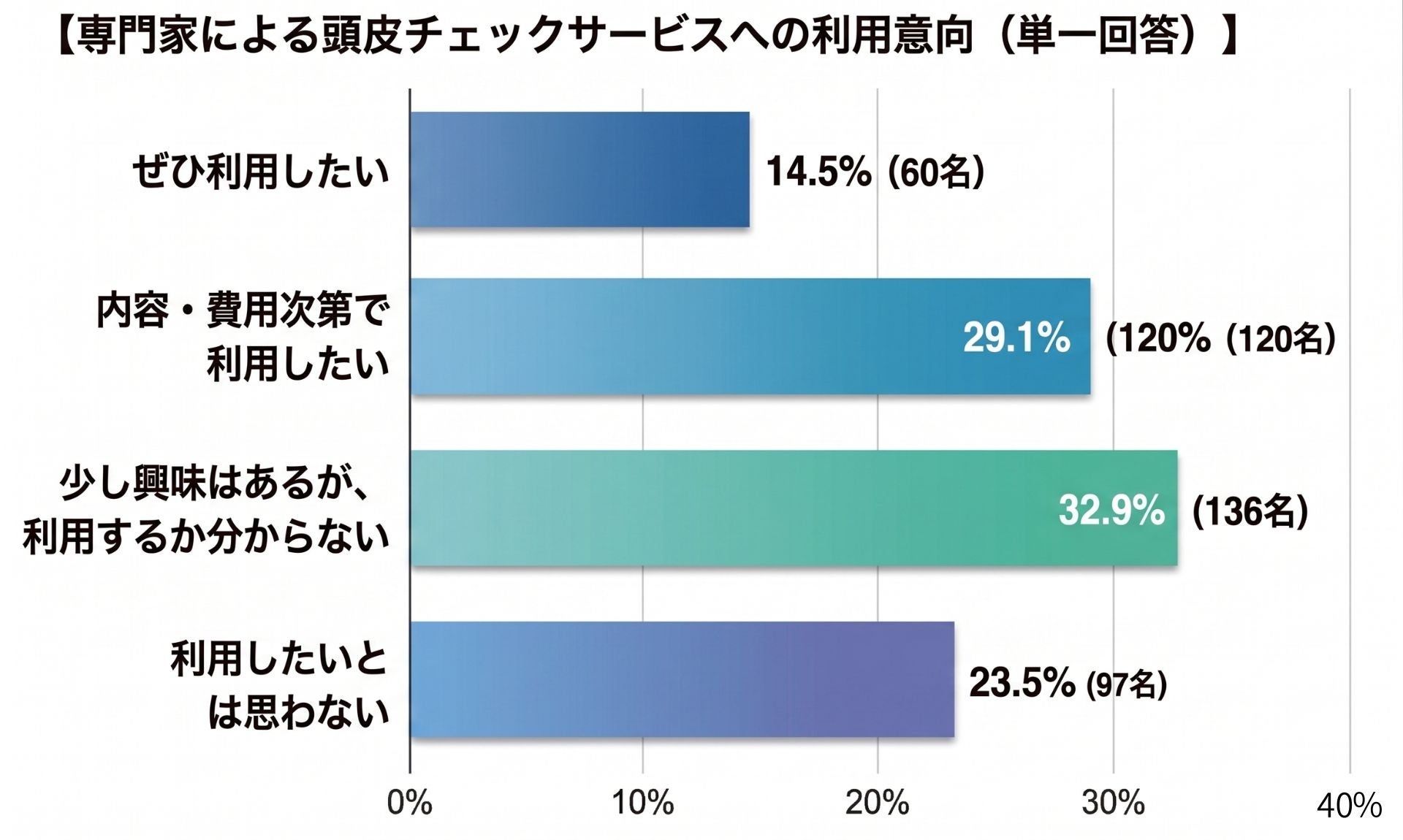 「季節ごとの頭皮の状態を、専門家にチェックしてもらえるサービスがあれば、どう思いますか?」と尋ねたところ、「ぜひ利用したい」(14.5%)と「内容・費用次第で利用したい」(29.1%)を合わせて43.6%が前向きな利用意向を示しました。