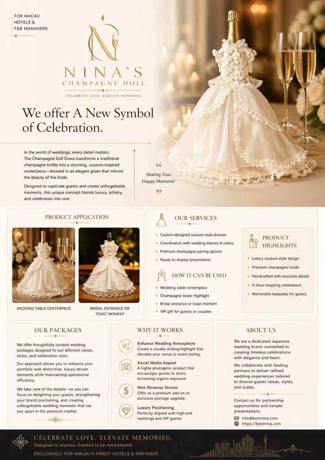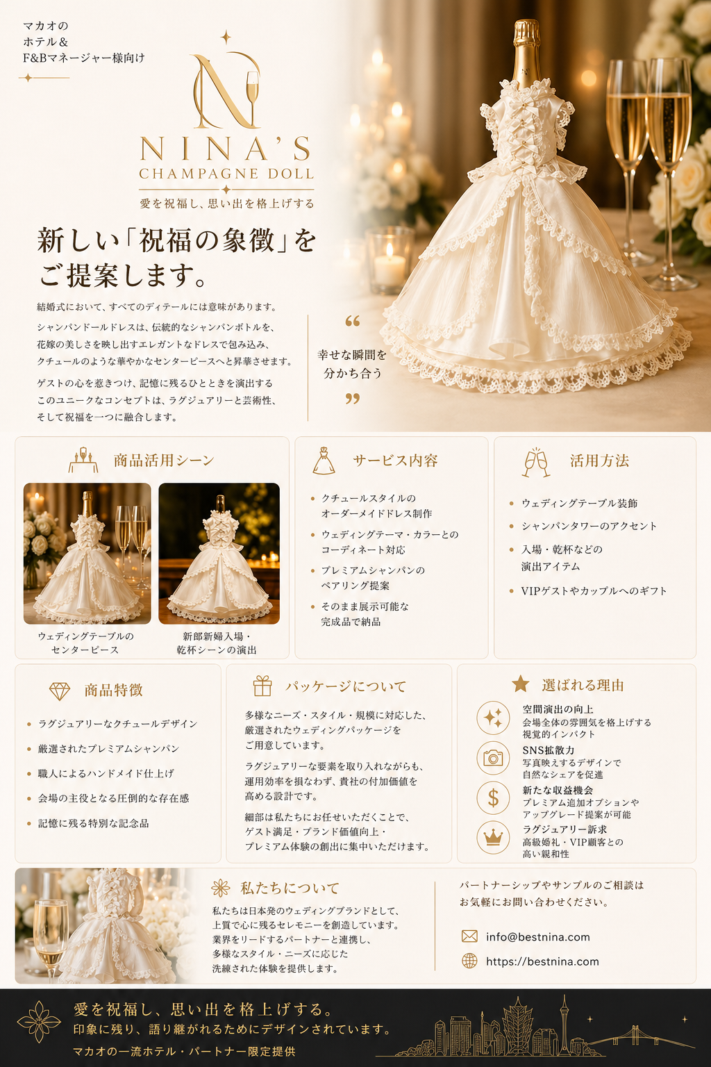 日本発のラグジュアリーウェディングブランド「NINA’S CHAMPAGNE DOLL(ニナズ・シャンパンドール)」は、ホテルおよびクラブ業界に向けた新たな収益機会として、「シャンパンドール」事業の本格展開を開始いたしました。