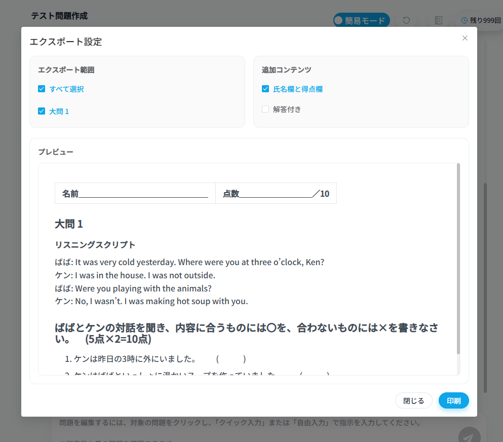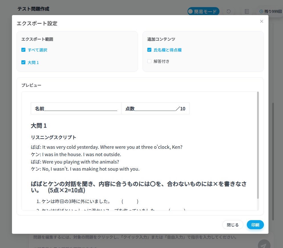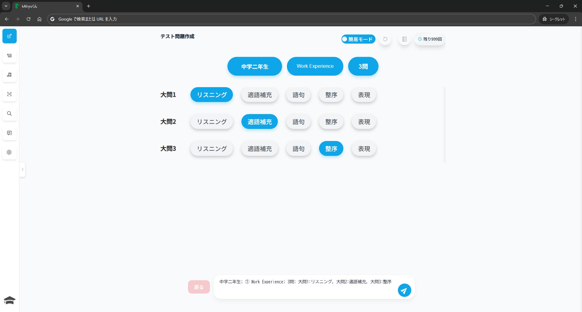 複雑な指示を入力する必要はありません。学年、単元、問題形式をボタンで選択するだけで、様々な教材が完成します。