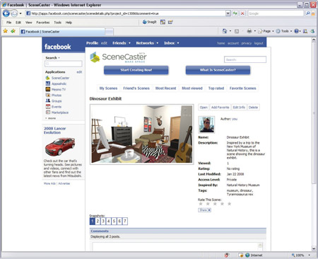 シーンキャスターは、多くのソーシャルメディアやネットワークサイトからの利用が可能です。Facebookでは既に最も利用されている3Dアプリケーションであり、クリエイティブ・アプリケーションの中でも最も利用率の高いものに数えられます。また、シーンキャスターが提供するバーチャルな空間の3D体験は個人の楽しみの枠を越え、オンラインストア、主要ブランドや小売業者の商品カタログなどにおいてコンテキスト広告や、商品やサービスをオンラインで売買する機会を提供します。