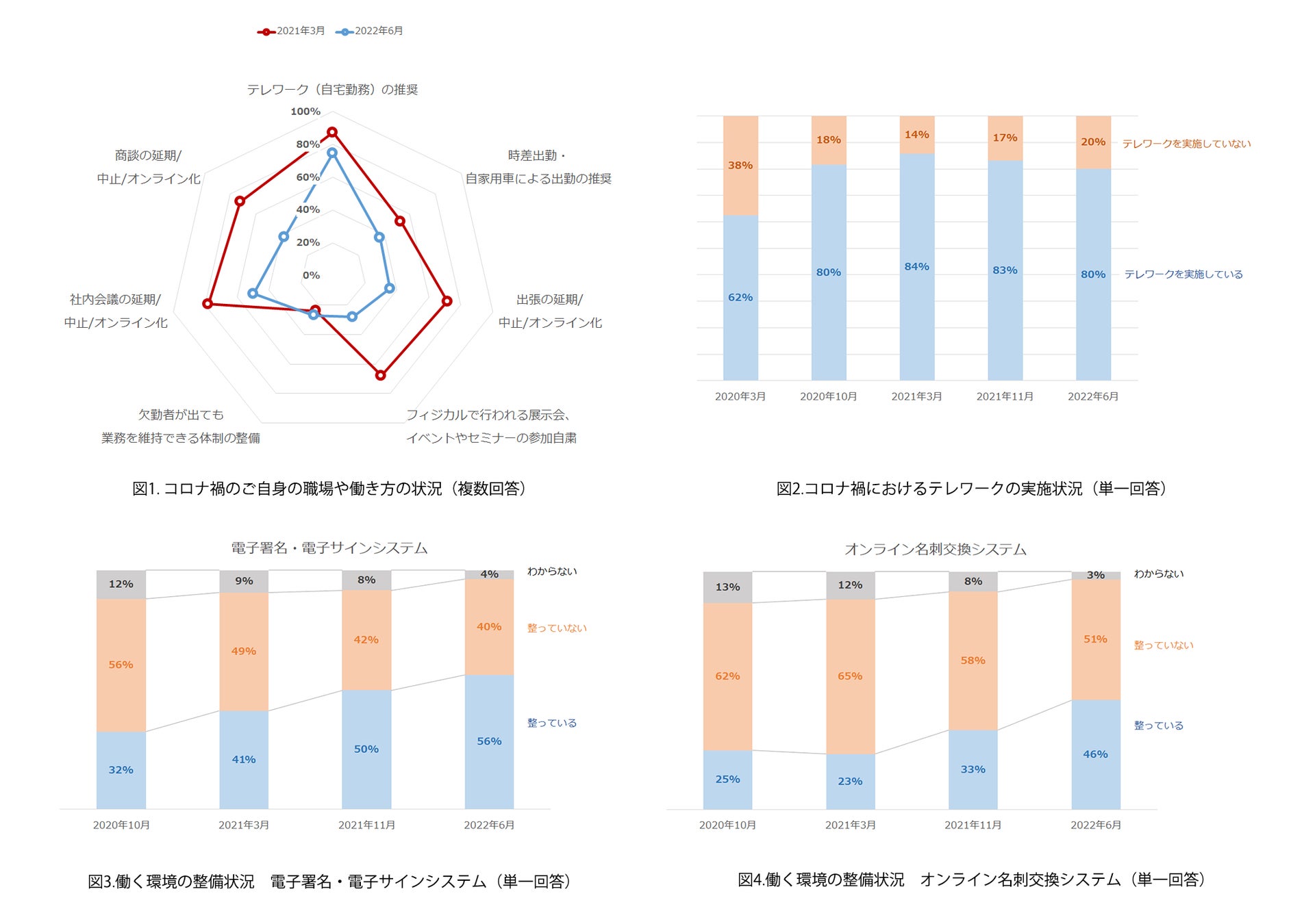 - 「電子署名・電子サインシステム」「オンライン名刺交換システム」の整備が急拡大し、テレワーク前提の環境整備がすすめられている