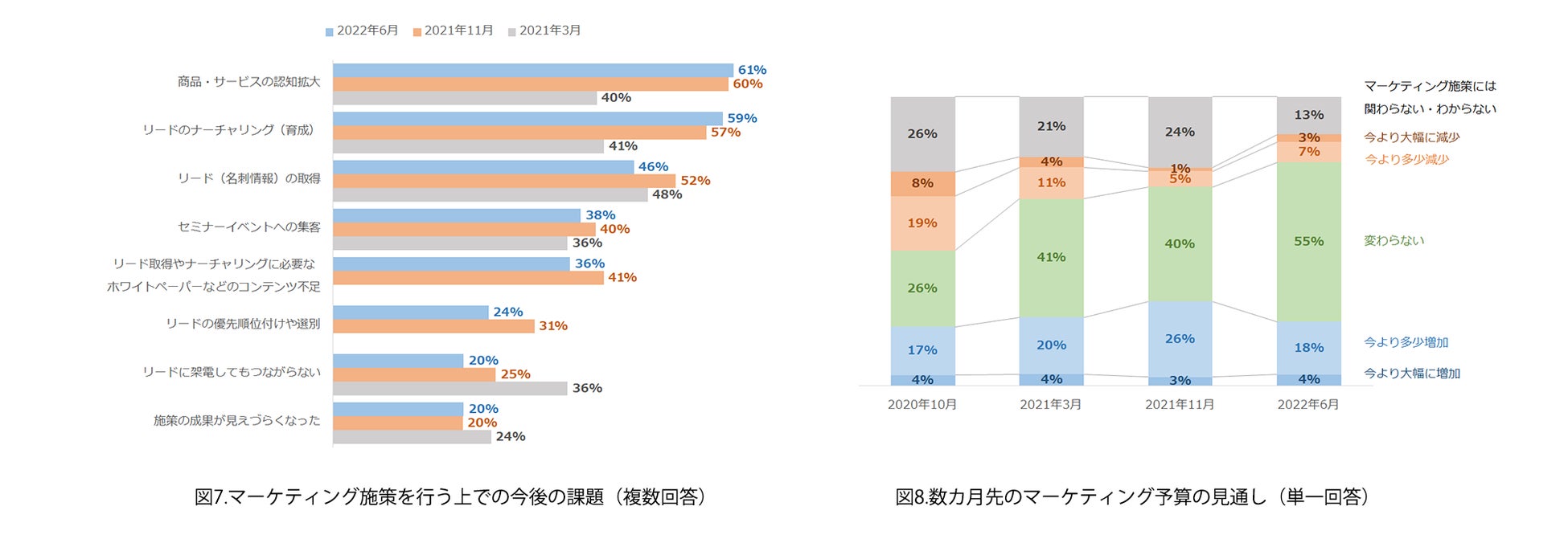 - マーケティング課題では、認知拡大やリードナーチャリング(育成)を挙げる企業が増加