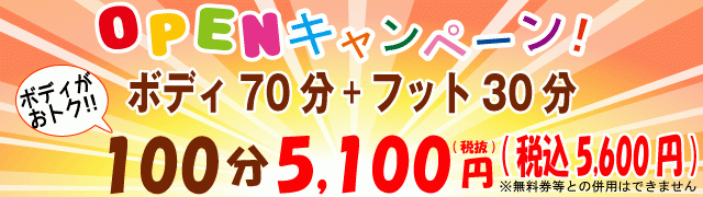 ボディケア70分+フット30分(100分) 5100円 (税込5600円)