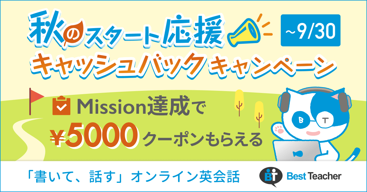 今回のリニューアルにあわせて、皆さまの英会話学習を応援する「秋のスタート応援!キャッシュバックキャンペーン」を開催いたします。
