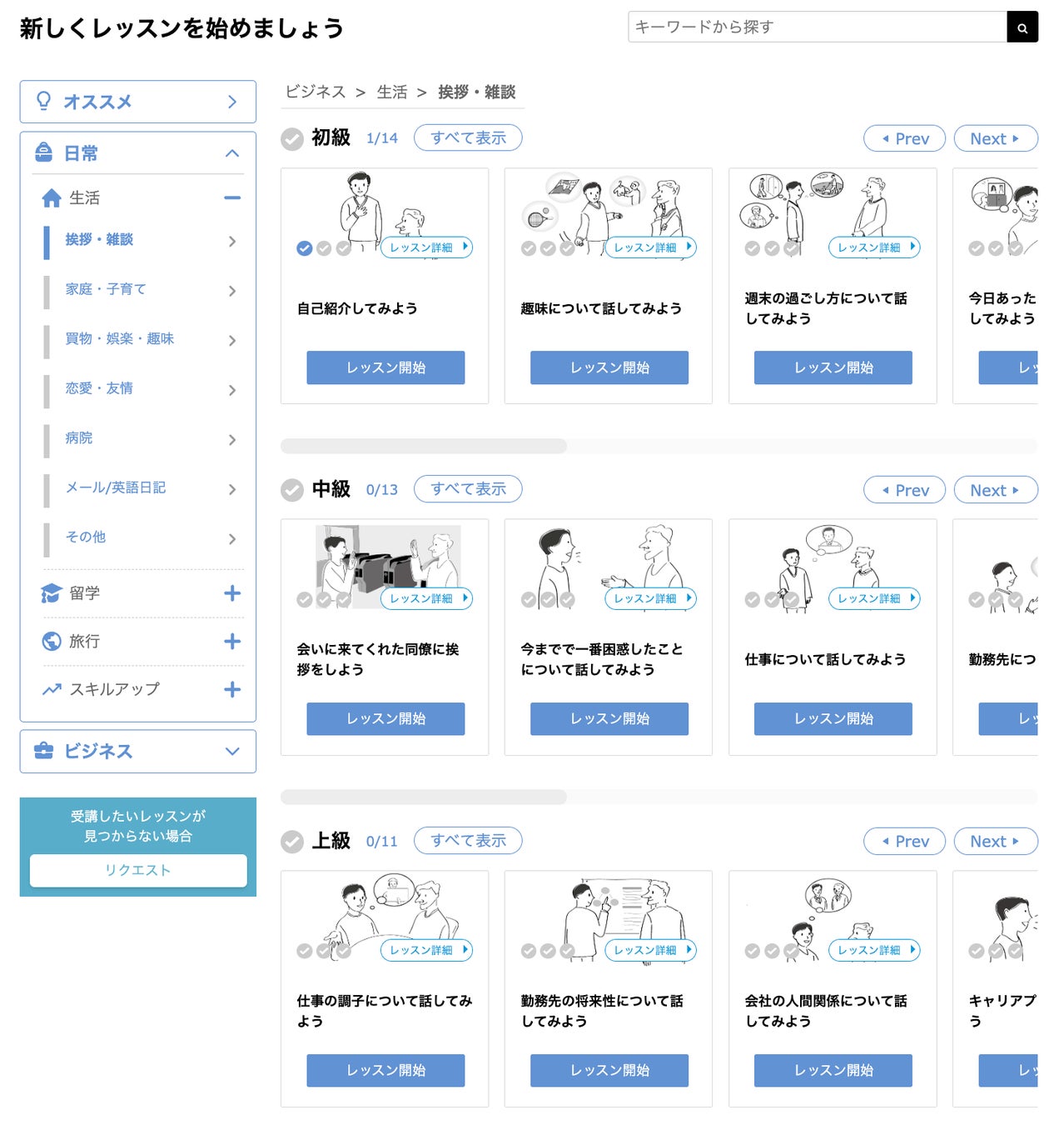 例えば「職場に英語でかかってきた電話に対応する」「留学先で受けたい授業について説明する」「入国管理官に、泊まるホテルを説明する」など、日常、ビジネス、留学など約1,000ものレッスントピックを提供しています。