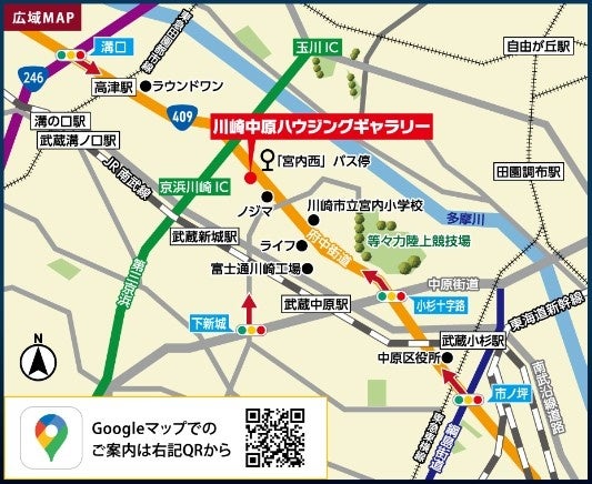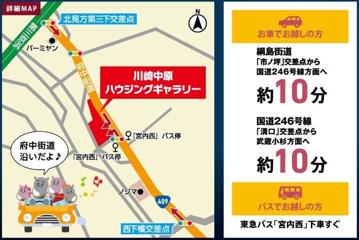 当会場は、川崎フロンターレ本拠地でおなじみの等々力陸上競技場近くの府中街道(国道409号線)沿いに位置しております。国道246号線や綱島街道、中原街道から府中街道に入って車で約10分と、市内外広範囲からのアクセスが良好です。公共交通機関からのアクセスも、東急田園都市線「溝の口駅」、「高津駅」や東急東横線・JR南武線「武蔵小杉駅」からバスで約10分、最寄りバス停「宮内西」目の前と、都心に住むファミリー層が足を運びやすい場所に位置しております。