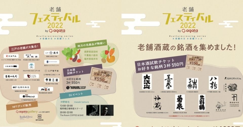 老舗による小売・飲食・展示/酒蔵11蔵による日本酒の試飲コーナー/老舗商品を購入体験できるマルシェ/The Room COFFEE & BARタイアップメニュー展開/有名DJによるライブステージ
