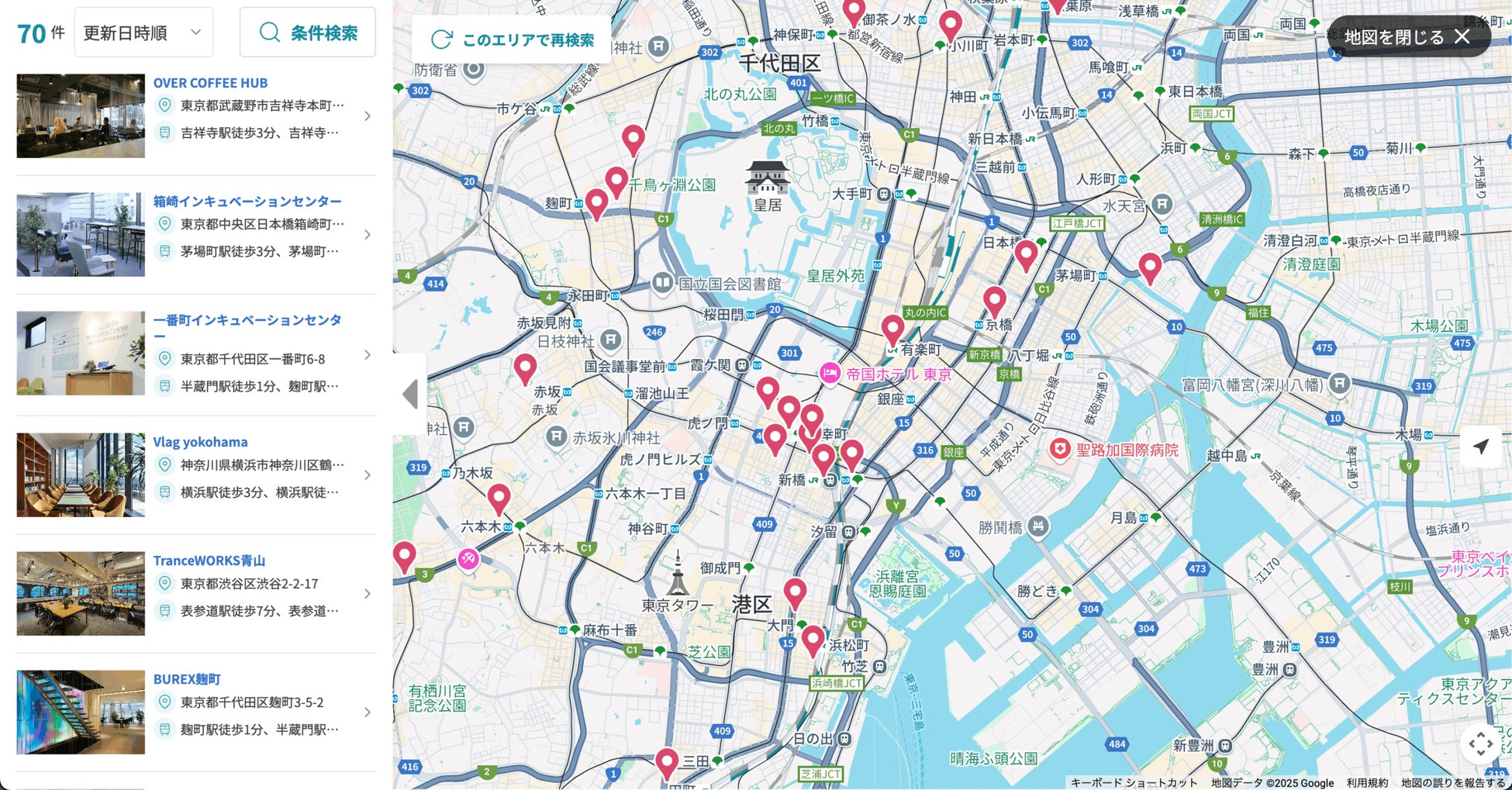 例えば「渋谷エリアで10名以上・月額賃料30万円以下・登記OK」の物件だけを瞬時に一覧化できるため、ニーズにぴったり合うスペースがすぐに見つかります。