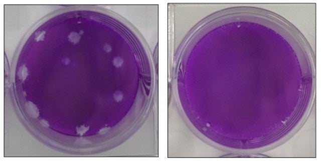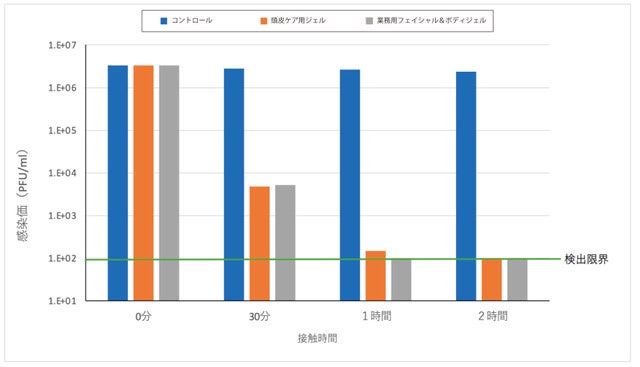 3.33x 10⁶ PFU/mlの新型コロナウイルスを頭皮用ジェル、および業務用フェイシャル&ボディジェルに接触させると、頭皮ケア用ジェルでは2時間後に、業務用ボディジェルでは1時間後に検出限界である<1.00x10²PFU/mlに減少した。