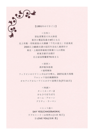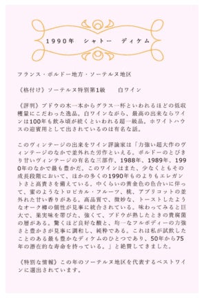 サプライズで受け取ったヴィンテージワインには、思い出の年から封じられた味わいが詰まっています。ワインそのものを味わっていただくだけでなく、あの頃はこんな時代だったと振り返れるこのカードは、まさに『年号タイムトラベル』の切符のような役割を果たしています。コロナ禍で出掛けて食事をなかなか楽しめないご時世ですが、思い出の地を再び訪れるように、思い出の年のワインで素敵なひとときを過ごしてみませんか。