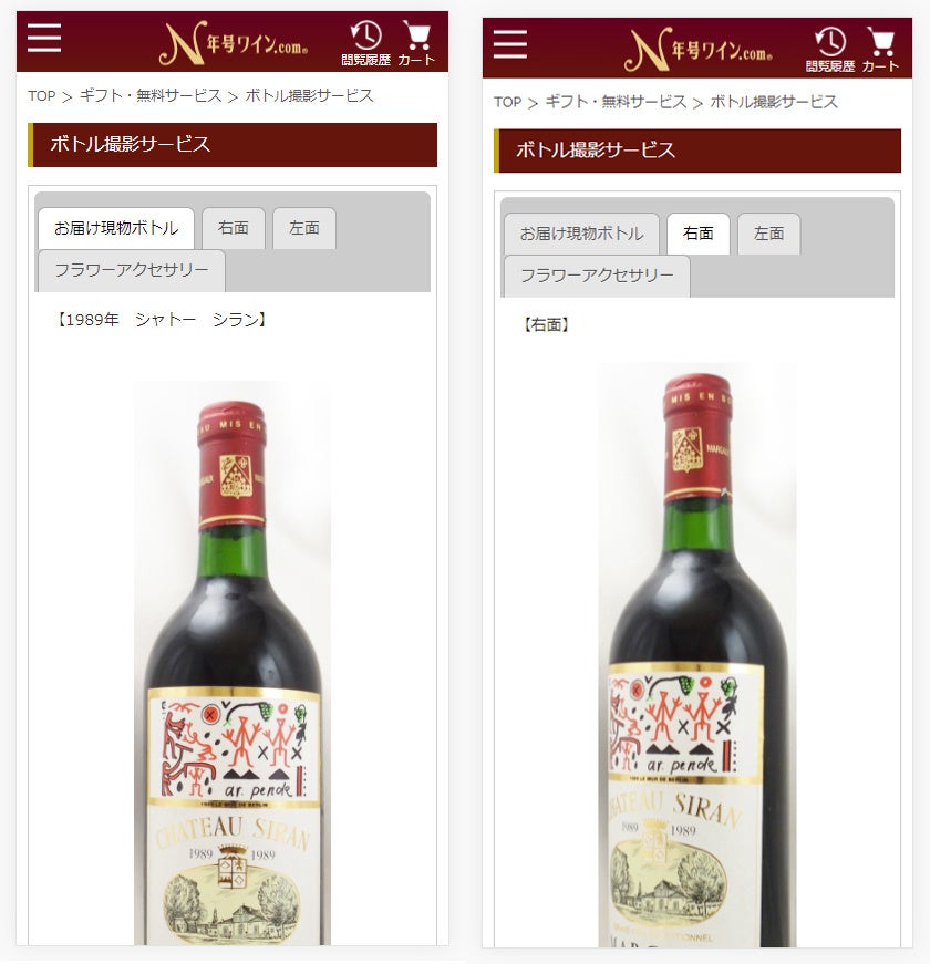 ご注文いただきましたワインは、現物のボトルを撮影してご案内しております。お届けするワインのコンディションがご購入前に確認できて安心です。また正面では写しきれないラベル左右についても左面、右面を撮影し、ご案内。