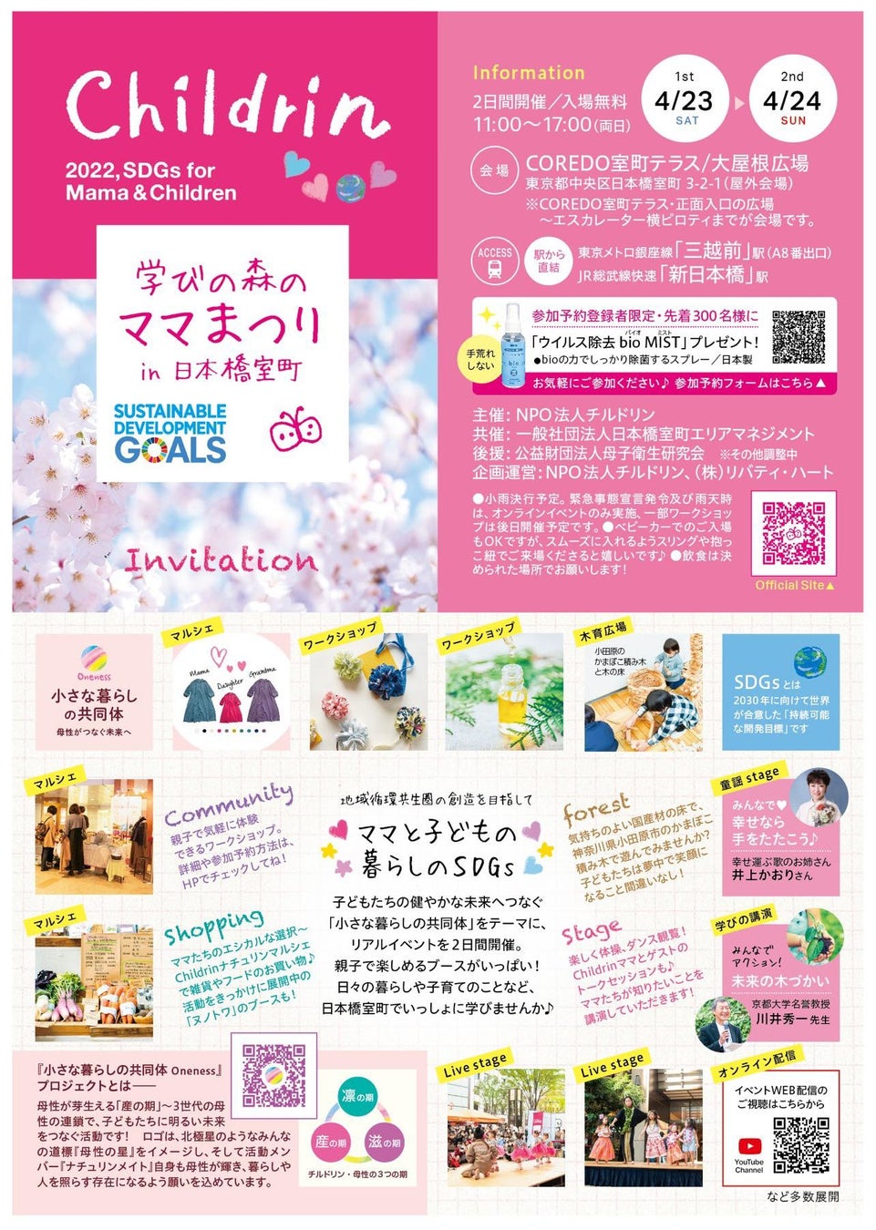 子育て支援団体・NPO法人チルドリン(代表理事:蒲生美智代・東京都中央区)は、2022年4月23日(土)、24日(日)COREDO室町テラス大屋根広場で「~暮らしのSDGs~学びの森のママまつり」を開催します。メインテーマを「暮らしのSDGs」として、自然との共創で循環する未来のために、親子で楽しめるイベントをコーディネートします。
