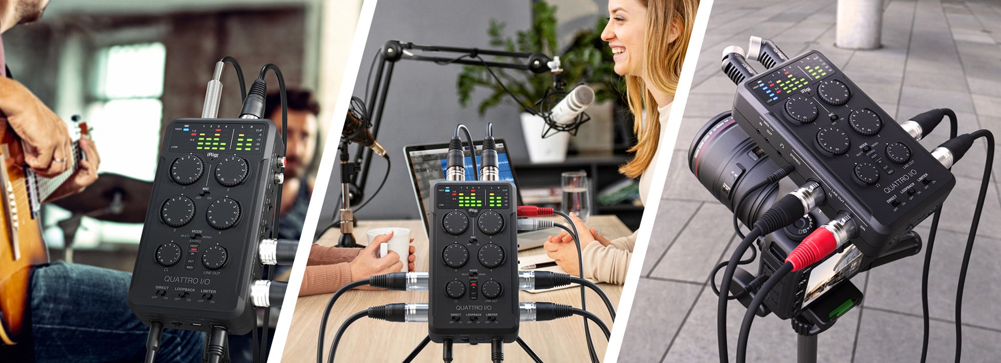 iRig Pro Quattro I/Oには、ファンタム電源を備えた高品質で低ノイズのマイク・プリアンプ、Hi-Zの楽器、ライン・レベル対応のXLR/標準コンボ入力、ステレオのRCA、3.5mmライン入力に、ヘッドフォン・アウト、バランスXLRアウト、3.5mmステレオ・アウトと、MIDI IN/OUTを備えています。iPhone、iPad、Mac/PC対応のインターフェースとしてだけでなく、ダイレクト・モニタリング機能、内蔵リミッターを備えた単体のマイク・プリアンプ、ミキサーとして、デジタル一眼カメラなどでの収録時にお使いいただけます。
