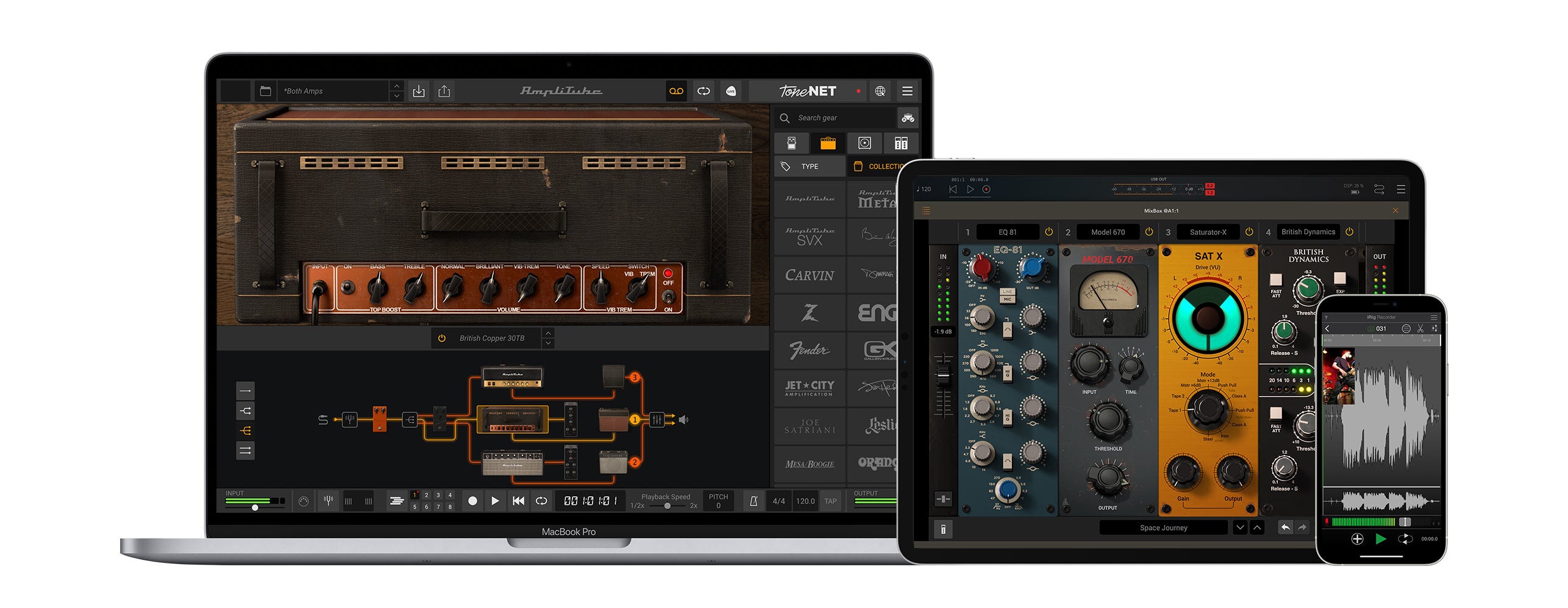 iRig Pro Quattro I/Oのユーザー登録を行うと、約8.3万円相当のMac/PCソフトウェアが特典として提供されます。EQ、コンプレッサー、リバーブなど10種類のプロセッサーを搭載したT-RackS 5 SE、ギターとベースに必要な80以上のギア・モデルを搭載したAmpliTube 5 SEに加え、MODO BASS SE、MODO DRUM SE、Miroslav Philharmonik CE、SampleTank SE、Syntronik SEから2製品をお選びいただけます。あわせてMixBox CS for iPad、iRig Recorder 3 LEなどにてフル仕様がアンロックされる、約1.2万円のアプリ内課金相当の特典も提供されます。