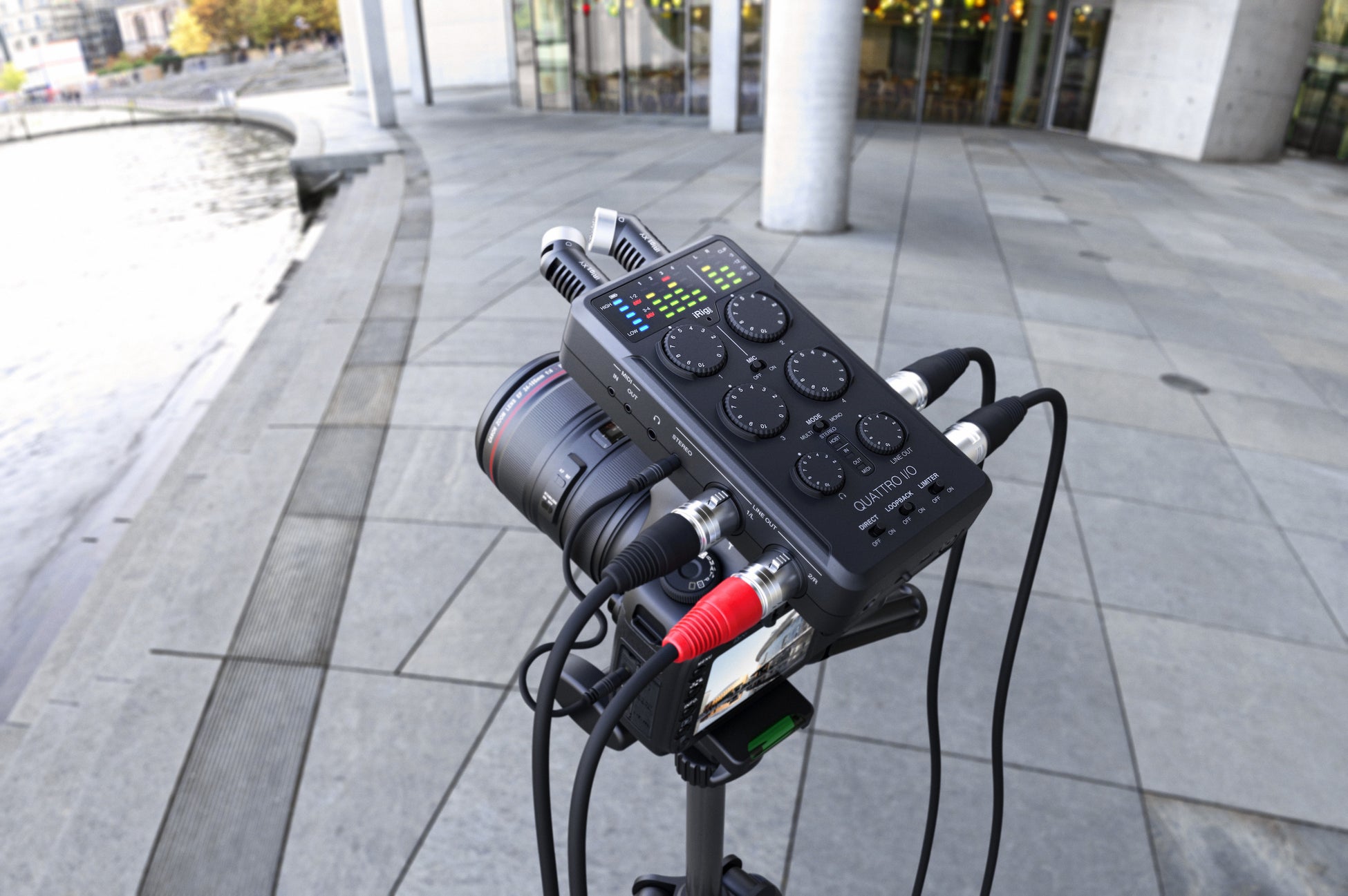 iRig Pro Quattro I/Oは、ダイレクト・モニタリング機能をONにすることで、高品位なマイク・プリアンプ4機を搭載した単体のミキサーとしても利用可能です。iRig Pro Quattro I/Oの底面にはカメラ標準のUNC 1/4-20アダプタも装備されているので、デジタル一眼カメラにマウントしてお使いいただけます。ヘッドフォン・アウトはカメラ接続用の3.5mmステレオ・アウトとは別に用意されており、収録中もダイレクト・モニタリング可能です。バランスXLRアウトを使えば、手元の機材をまとめてPAに送るミキサーとして重宝することでしょう。