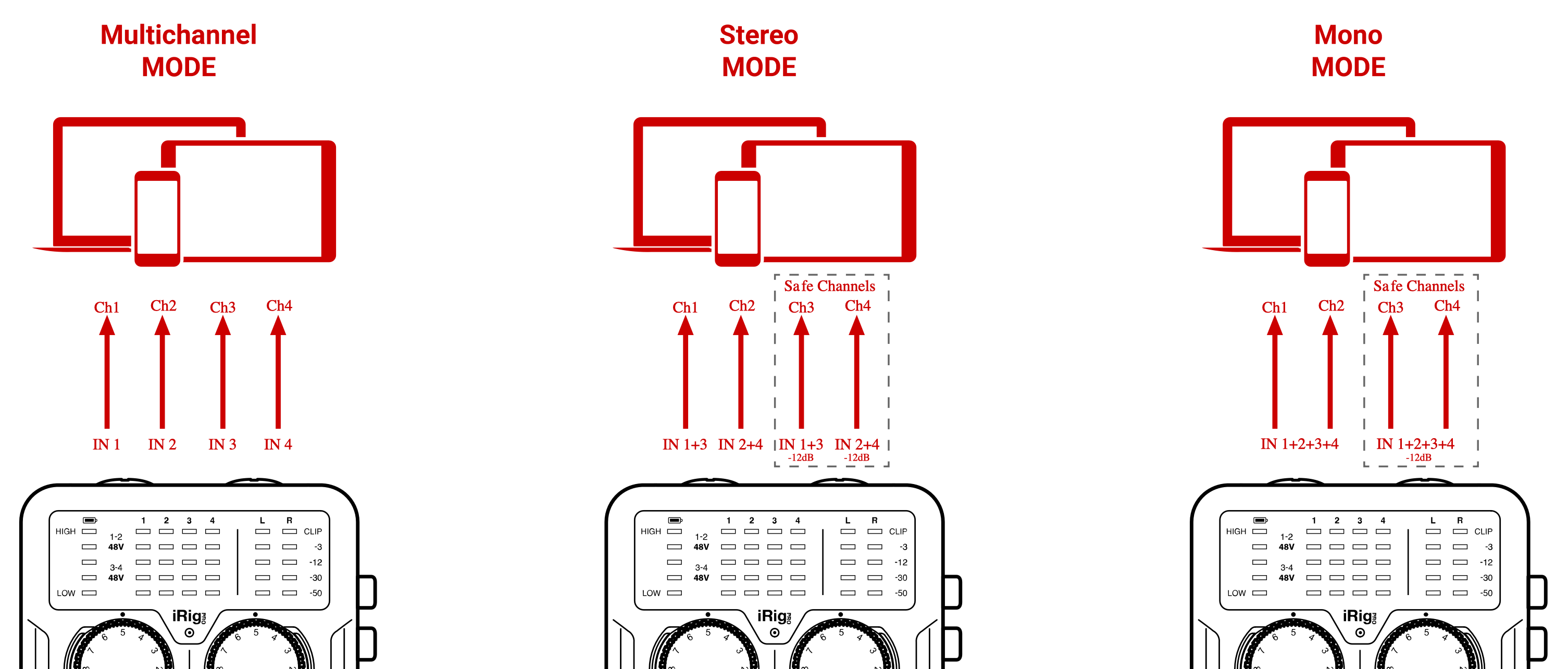 iRig Pro Quattro I/Oに、別売の電源アダプタ(iRig PSU 9175、Deluxe版には同梱)を接続すれば、Lightningケーブルで接続されたiPhone、iPadを充電しながら利用可能で、長時間のリハーサル、待機時間を要するライブ配信、収録でも安心です。モード・スイッチにより、4chのインプット、内蔵MEMSマイク、Loopbackを含めたすべての入力がミックス・ダウンされるSTEREOモード、MONOモードを選択できるので、ご利用のアプリケーションにより最適なモードをお選びいただけます。