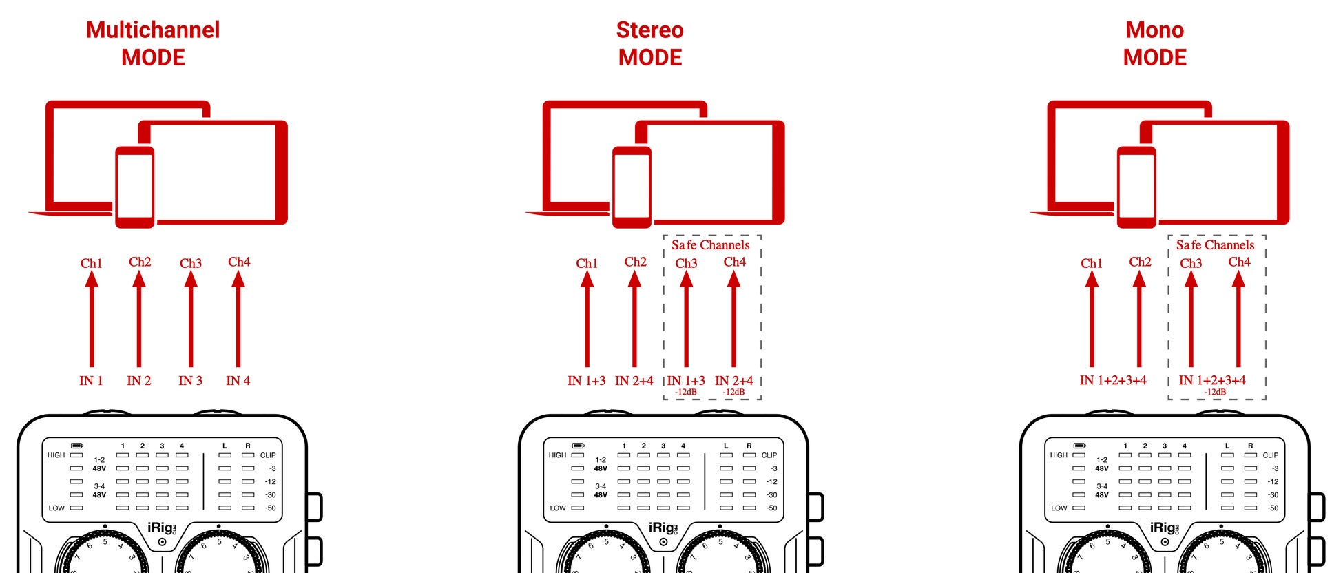 GarageBand、Logic ProなどDAWの利用時は、モード・スイッチにてMULTIを選べば、マイク/Hi-Z楽器入力対応のMIC/INST IN 1-2をInput 1-2、マイク/ライン入力対応のMIC/LINE IN 3-4、RCA IN 3-4もしくは3.5mm Stereo IN 3/4をInput 3-4としてマルチにルーティング可能です。iRig Pro Quattro I/OにはMIDI IN/OUTもあるので、iPhone、iPad、Mac/PC対応のモバイル24-bit/96kHzオーディオMIDIインターフェースとして、外出時に欠かせない1台となることでしょう。