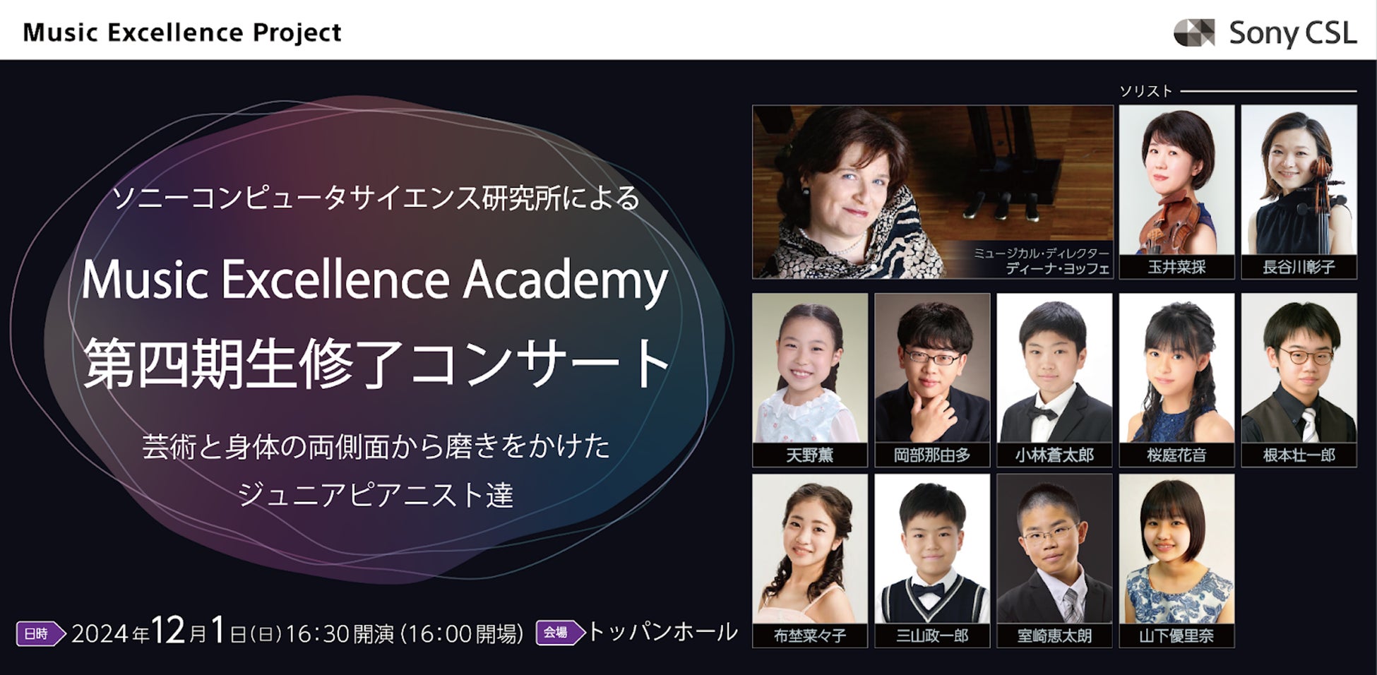 本アカデミーは、ソニーCSL - 東京リサーチ リサーチディレクターの古屋晋一による研究活動の一環として実施されており、音楽ディレクターにはディーナ・ヨッフェ氏を迎えています。その四期目の修了を発表する場として、1年間の教育・トレーニングを実施してきたジュニアピアニスト9名が演奏を行う「Music Excellence Academy 第四期生 修了コンサート」を12月1日に開催いたします。そして、今年はバイオリン奏者である玉井菜採さん(東京藝術大学教授)とチェロ奏者である長谷川彰子さん(新日本フィルハーモニー交響楽団首席チェロ奏者)をお迎えし、デュオ・トリオのプログラムもご用意いたします。