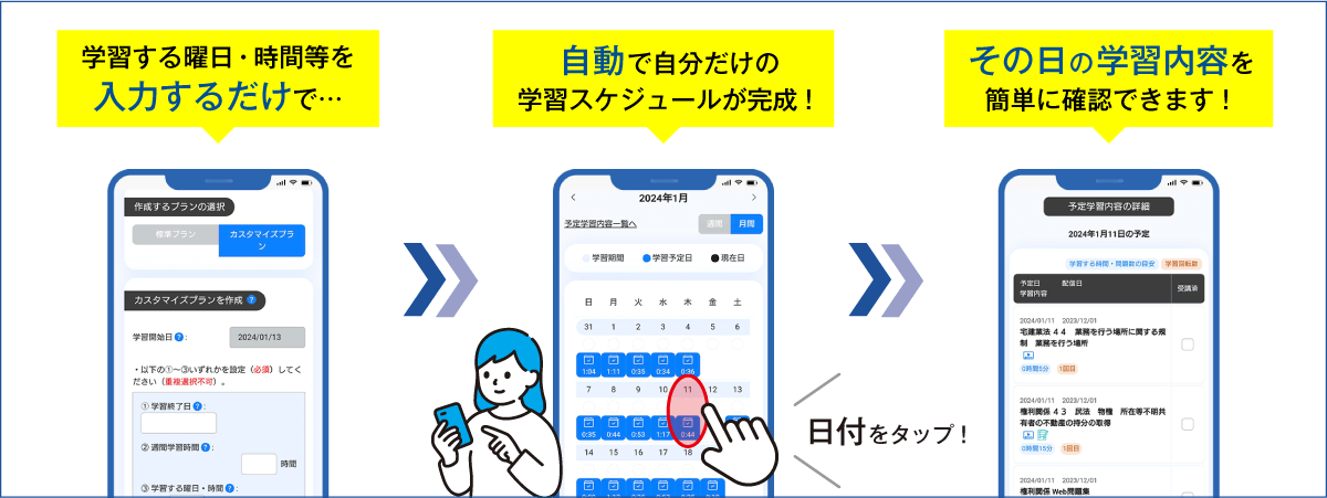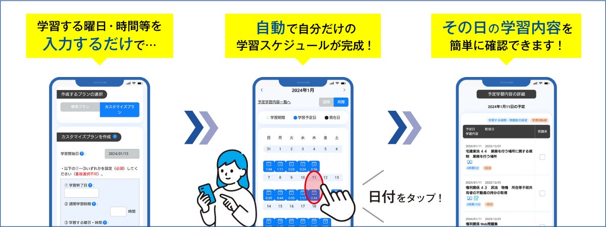 スケジュール管理機能では、学習開始日や1週間の学習時間目安などを入力すれば、試験日までの学習スケジュールを自動で作成できます。また対面での通学講座も提供する資格の大原だからこそのフォローやサポートも万全。講師による質問対応はもちろんのこと、大原学園各校の自習室を利用できます。