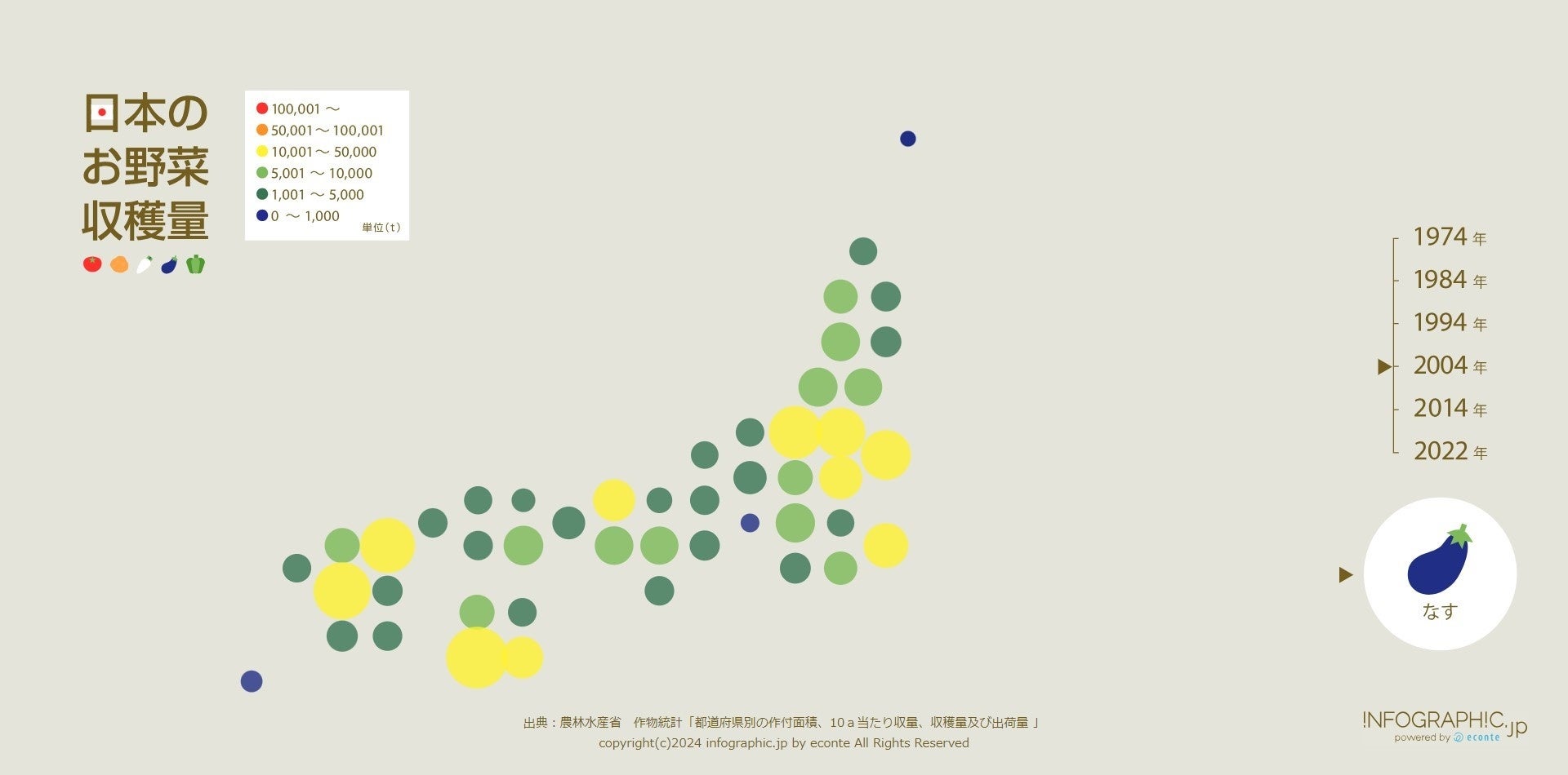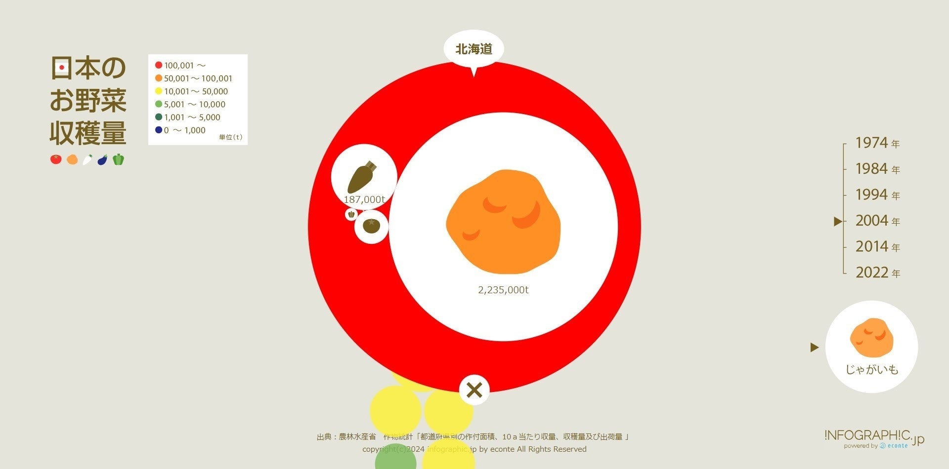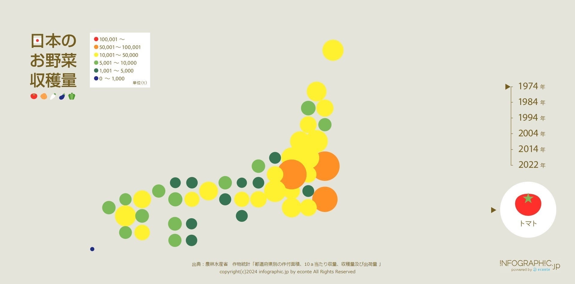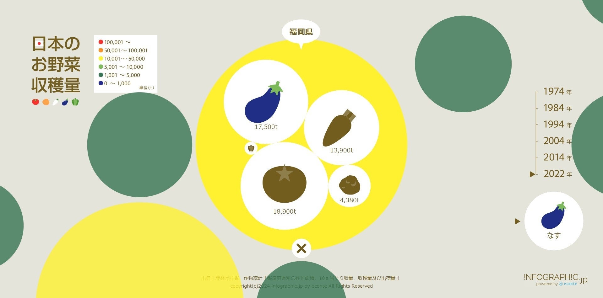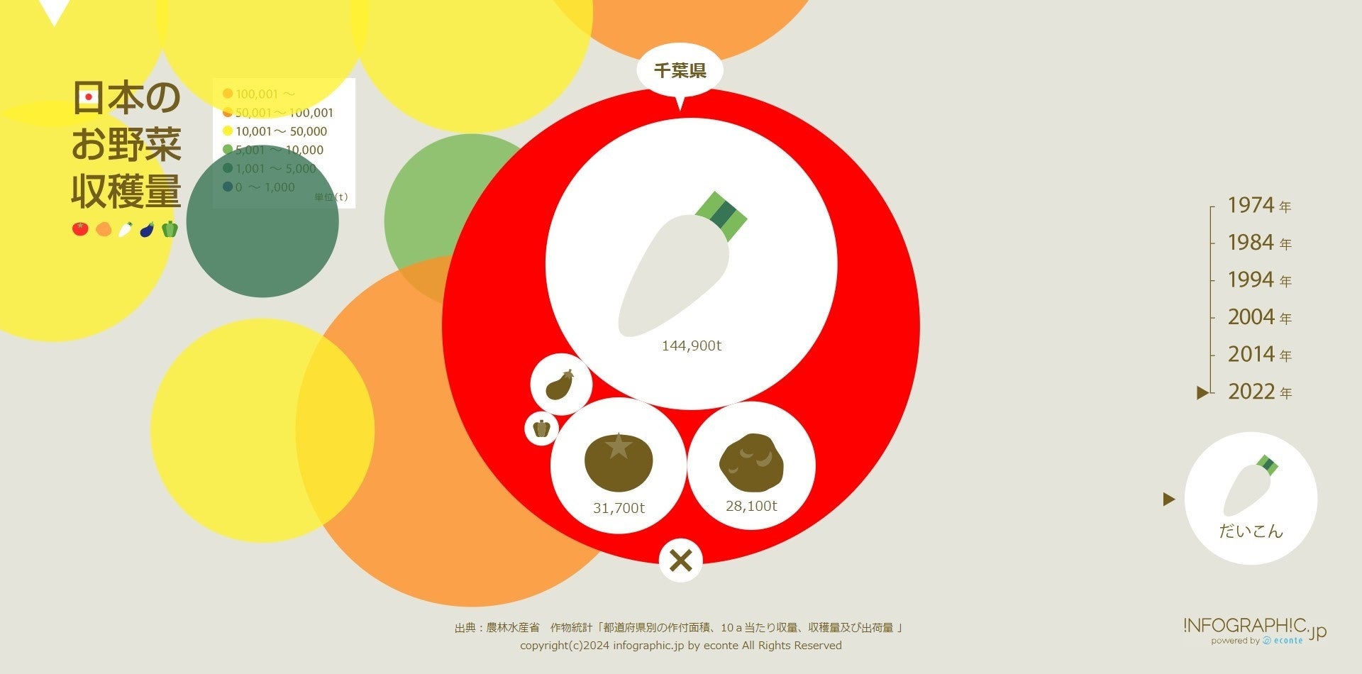 「日本のお野菜収穫量」は、農林水産省の作物統計データを基に、都道府県別の野菜収穫量を円の大きさと色でポップに表現しています。「トマト」「じゃがいも」「大根」「なす」「ピーマン」の5種類の野菜の収穫量を、1974年/1984年/1994年/2004年/2014年/2022年の6つの年代で比較でき、さらに都道府県別でも確認することができます。