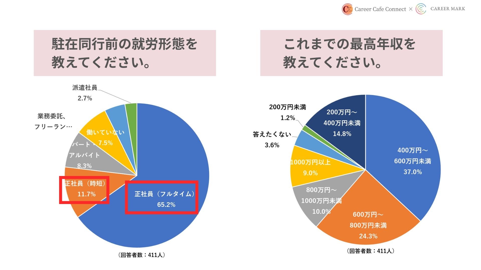・共働き時代だが、日本は配偶者が一度キャリア断絶すると正社員として、あるいは希望職への再就職が難しい。また、海外からのリモートワークができる会社・職種も少ないことや、子どもの教育面を考慮して、転職を選んだ友人がいる(タイ・30代前半)