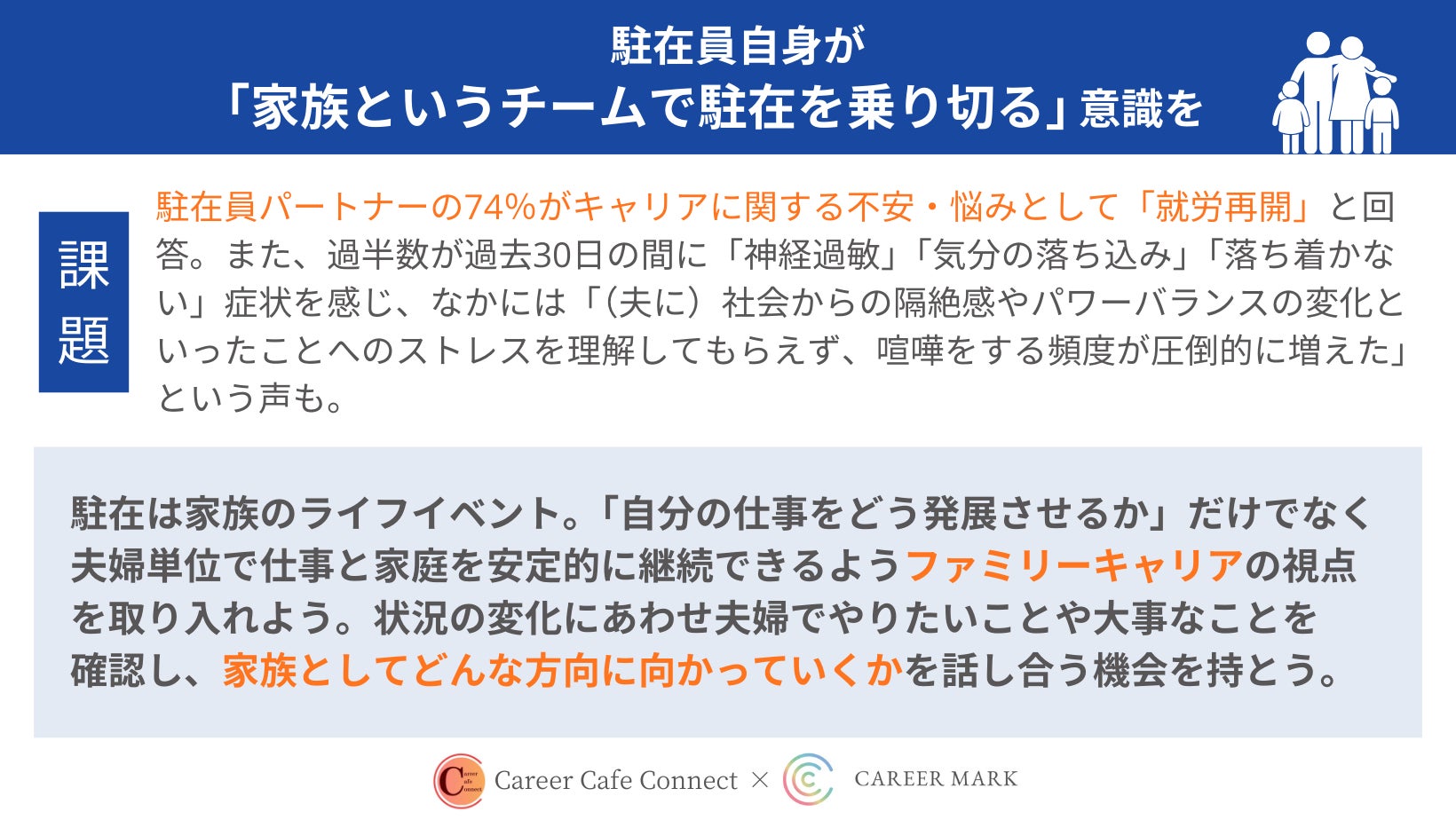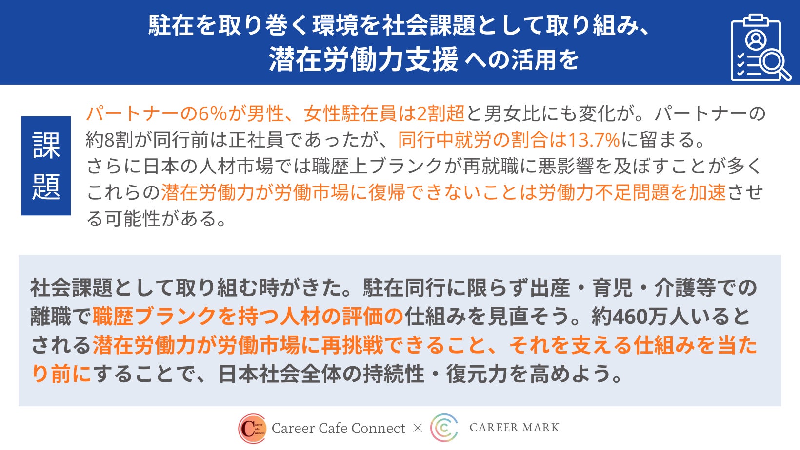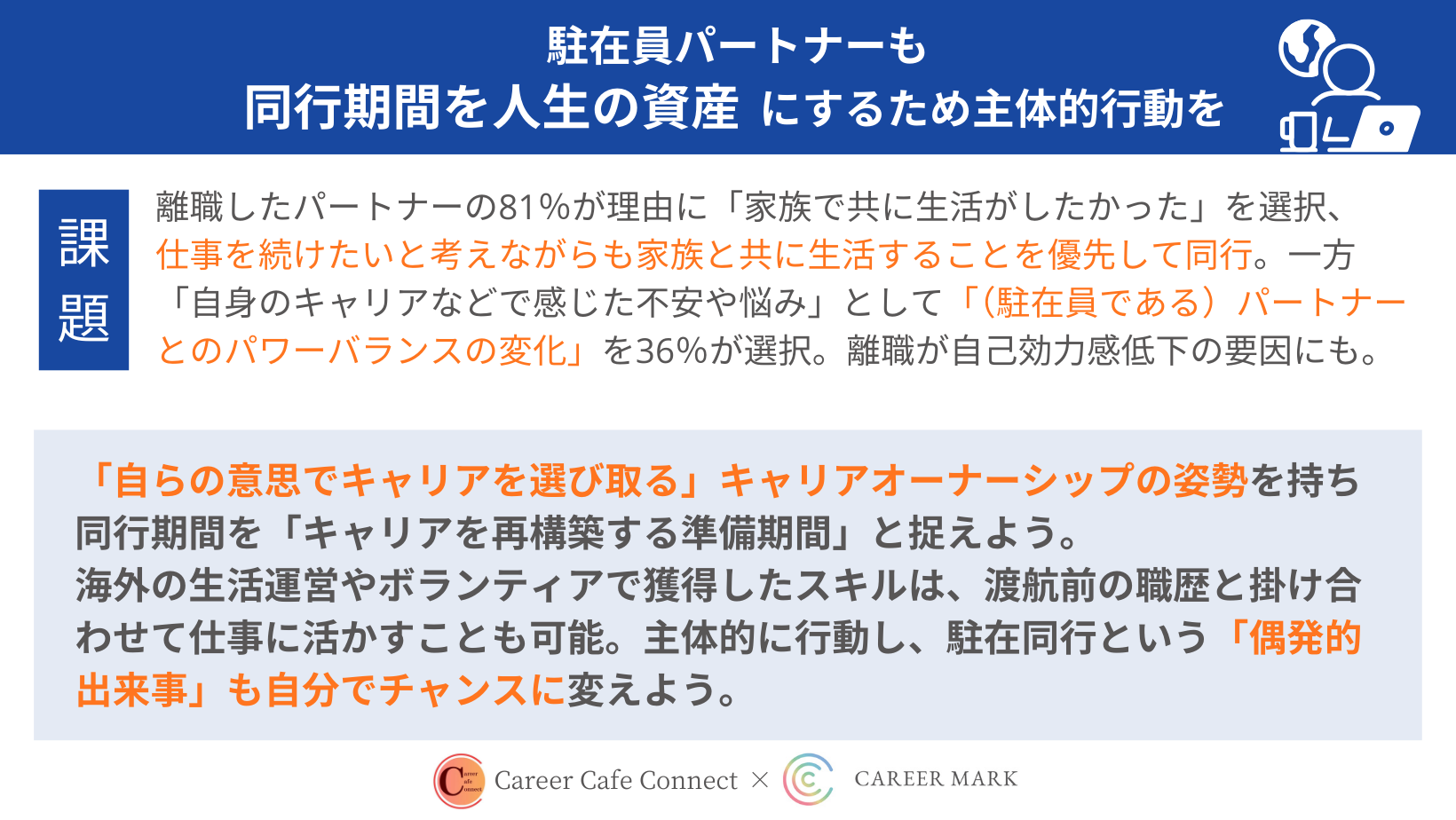 駐在員パートナーのキャリア課題の解消を通じて、駐在員とパートナーの双方が自分らしく納得のいくキャリアを築ける社会を目指して、Career Cafe ConnectとCAREER MARKが共同運営するプロジェクト。