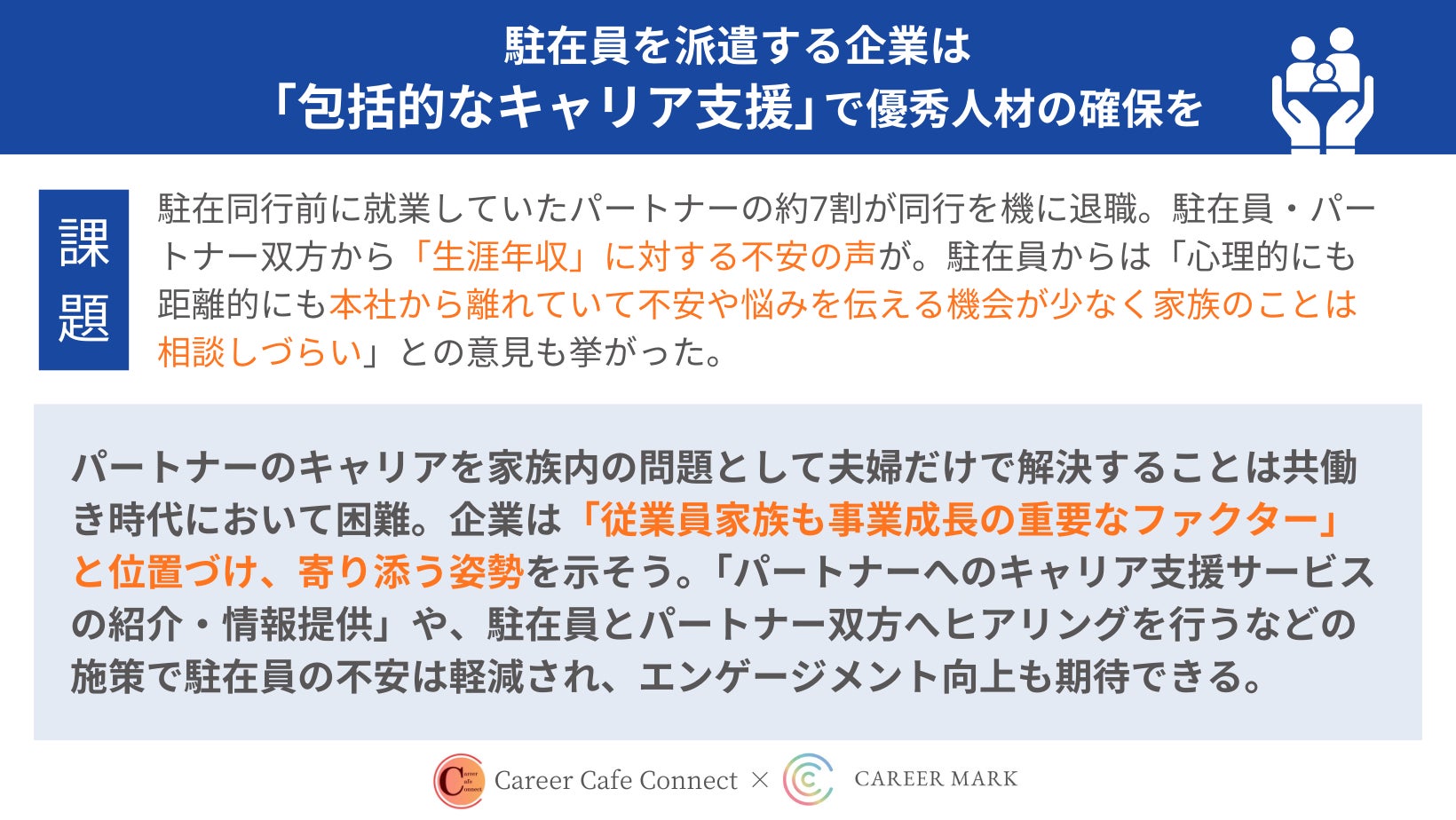 パートナーのキャリアを考慮して転職したり駐在を断るケースも出てきており、企業にとって「パートナーのキャリア問題」は、優秀な人材の確保や適正配置の観点からも見逃せない経営課題となりつつあります。