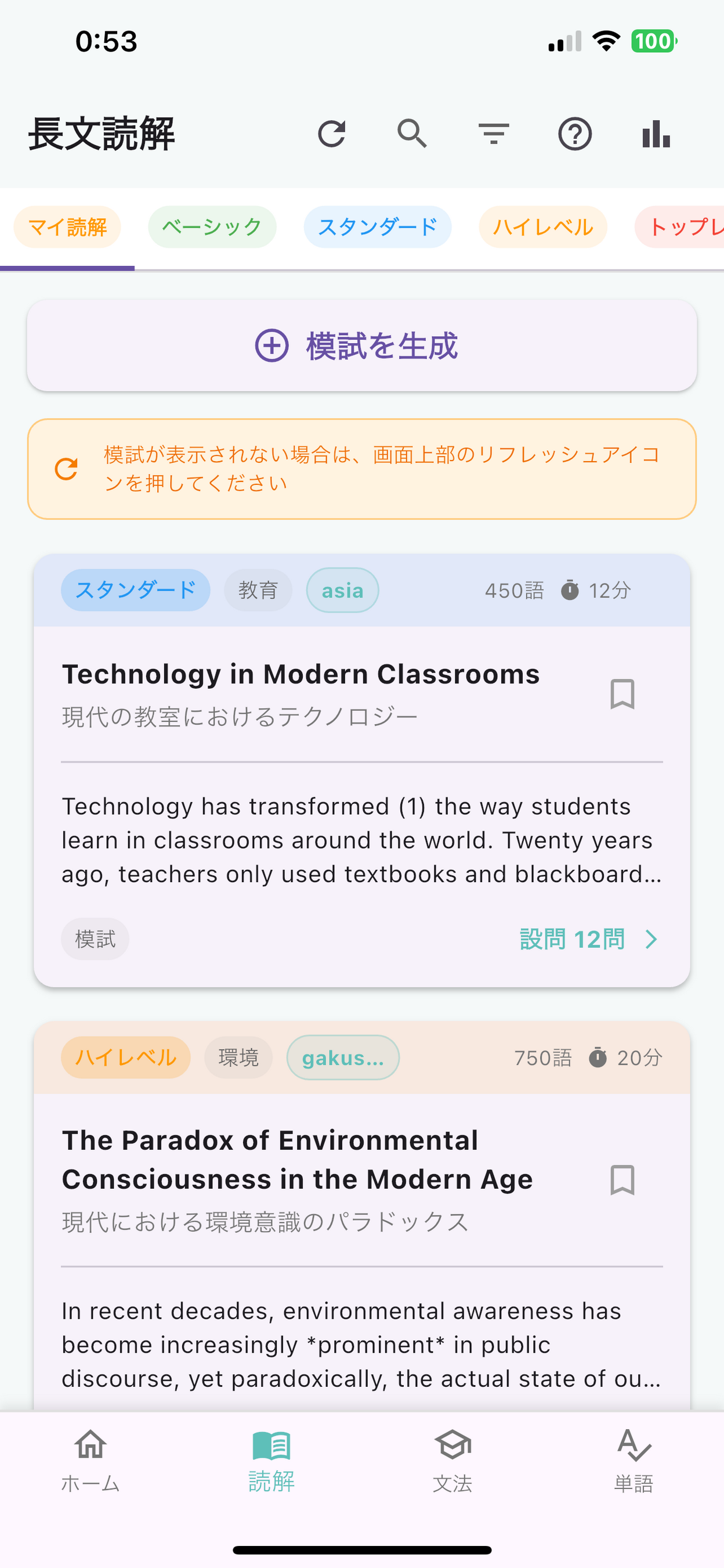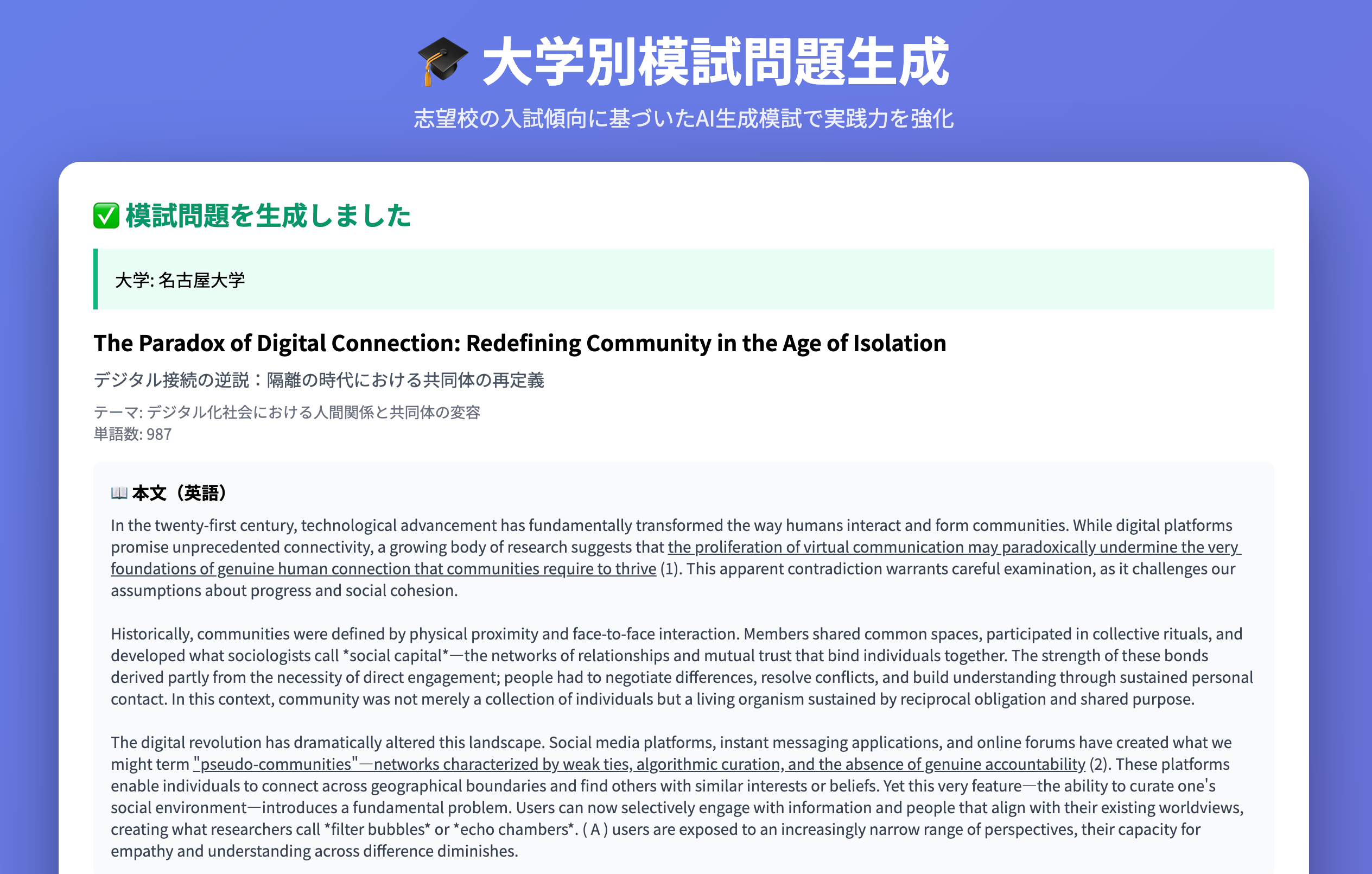 実際の入試問題と同レベルの英文読解問題を生成。例えば「The Paradox of Digital Connection: Redefining Community in the Age of Isolation」といった、現代社会の課題を扱った高度な長文読解問題を提供。