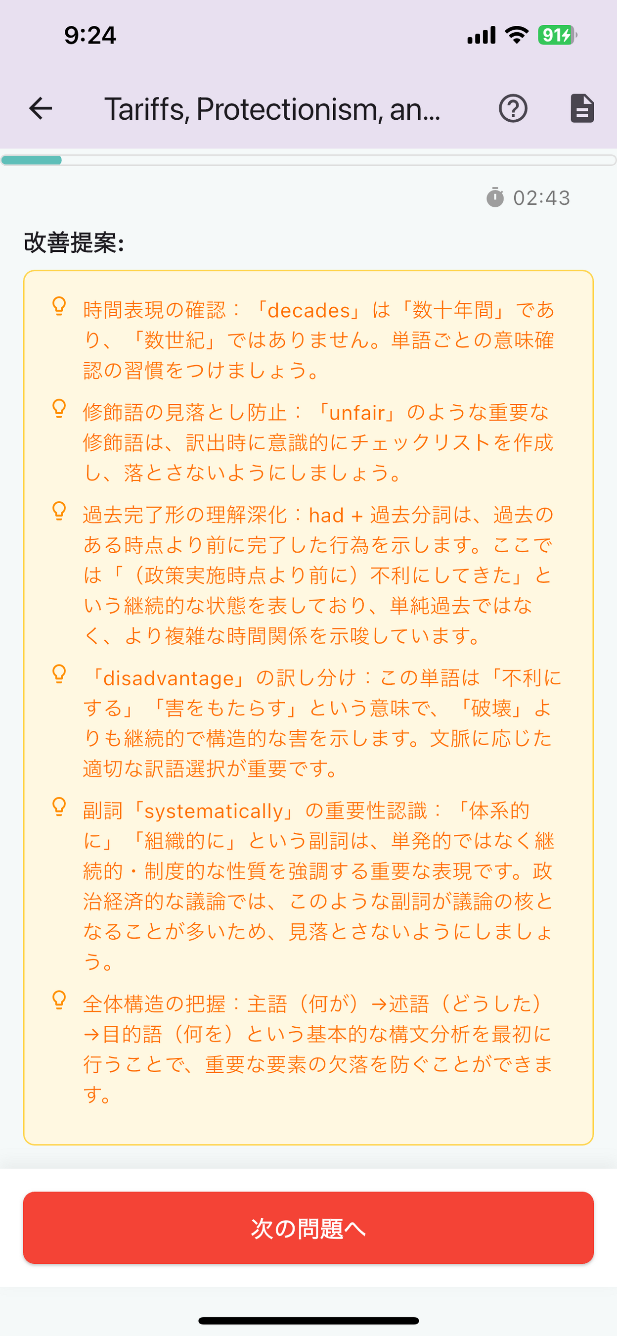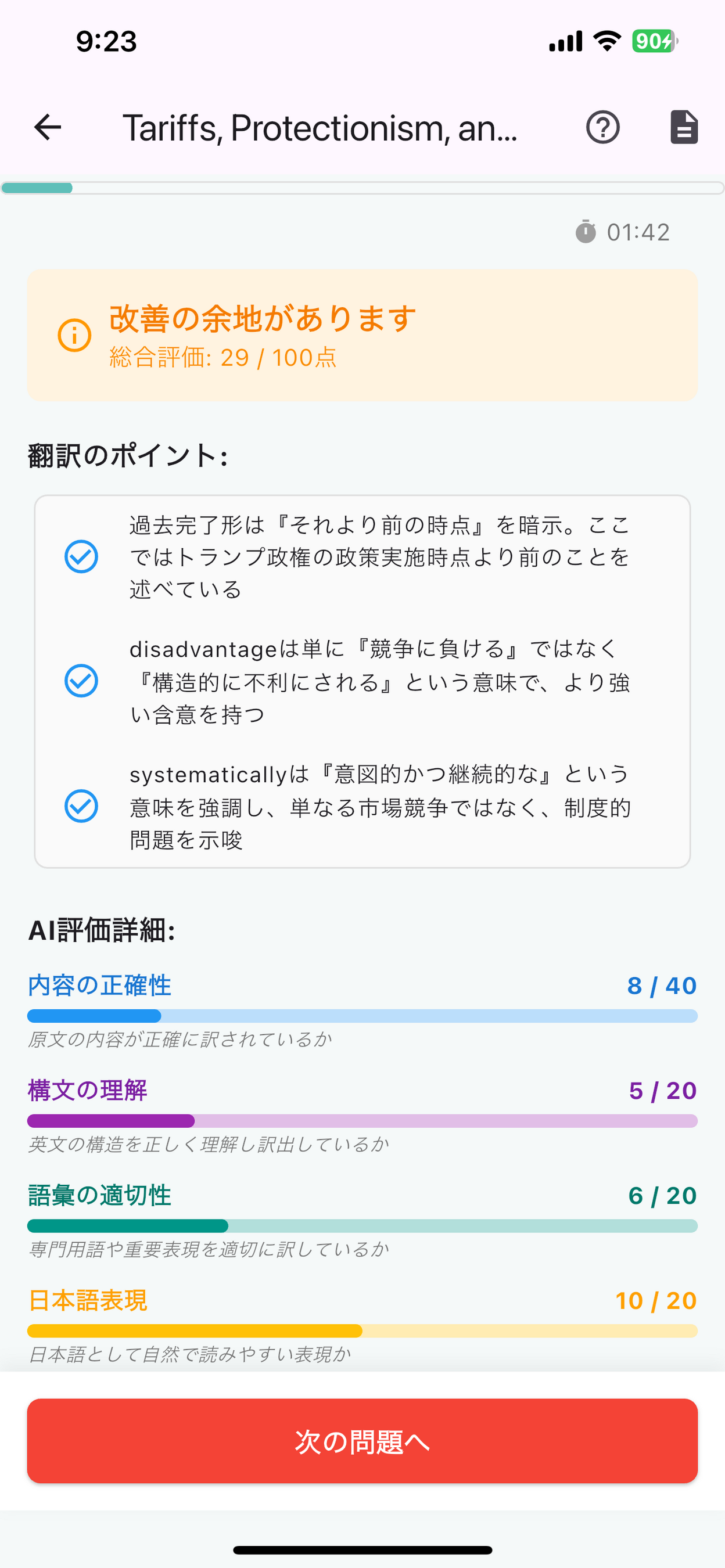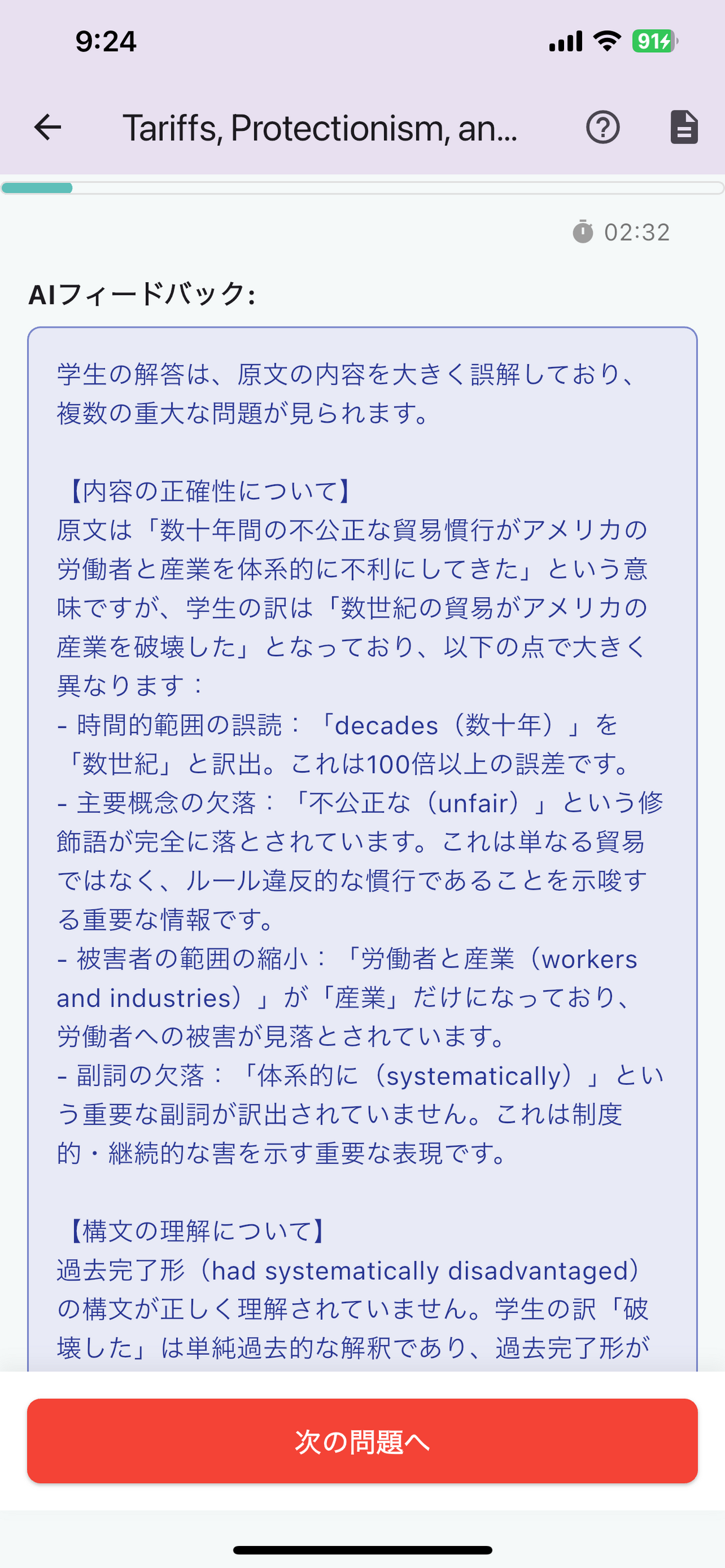 解答後は即座にAIが採点し、詳細なフィードバックを提供。翻訳の正確性だけでなく、文構造の理解度まで分析。