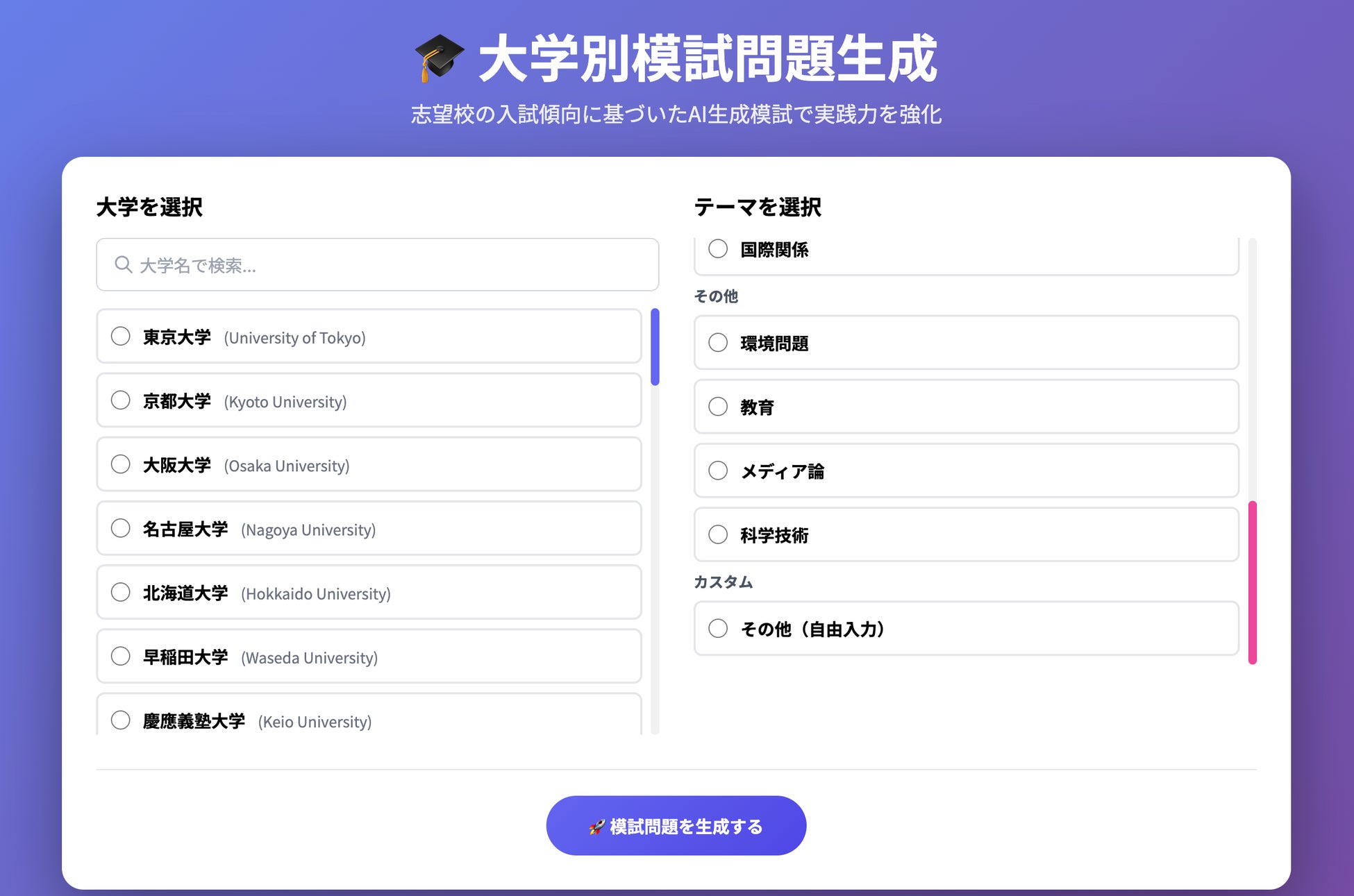大学入試において、各大学・学部ごとに出題傾向や難易度は大きく異なります。特に難関大学では、その大学特有の出題形式や頻出テーマへの対応が合否を左右する重要な要素となっています。しかし、従来の学習方法では、志望校別の十分な演習量を確保することが困難でした。