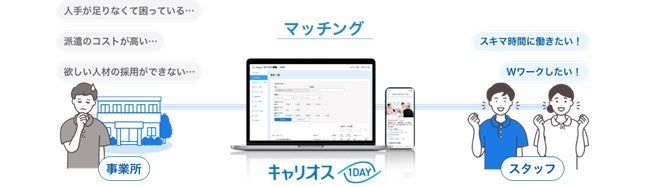 「キャリオス1DAY」は、すぐに人手が欲しい事業所と介護・看護の有資格者をマッチングする、介護・医療業界特化型スポット・単発バイトのマッチングサービスです。急な人員不足や慢性的な介護職・看護職の人手不足も解決に導きます。