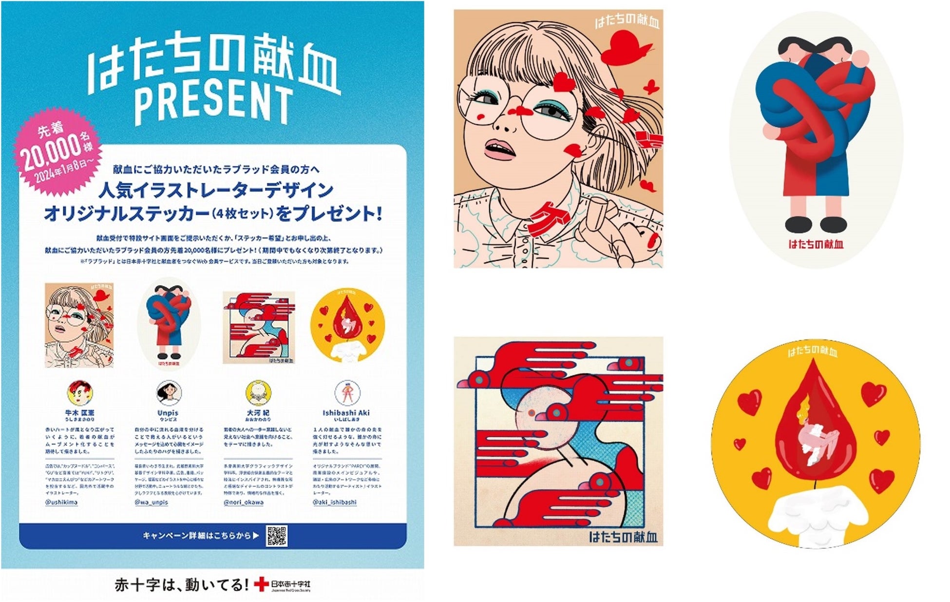 2024年1月8日(月)~2月29日(木)の期間においては、献血にご協力いただいた献血Web会員サービス「ラブラッド」会員の方先着2万名様に、人気イラストレーターの牛木匡憲さん、Unpisさん、大河紀さん、Ishibashi Akiさんが「はたちの献血」をテーマにデザインしたオリジナルステッカー(4枚セット)をプレゼントします。(※なくなり次第終了)