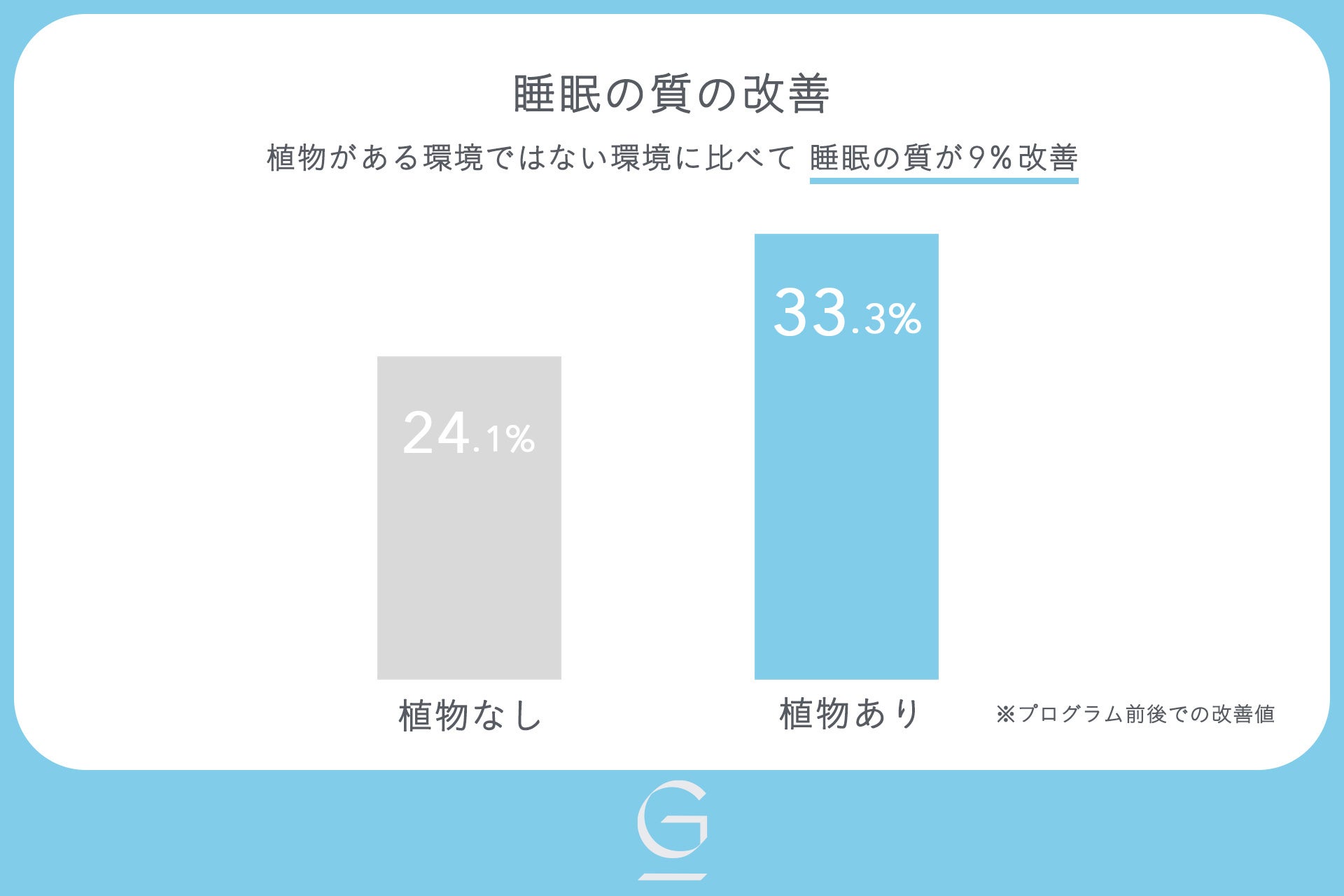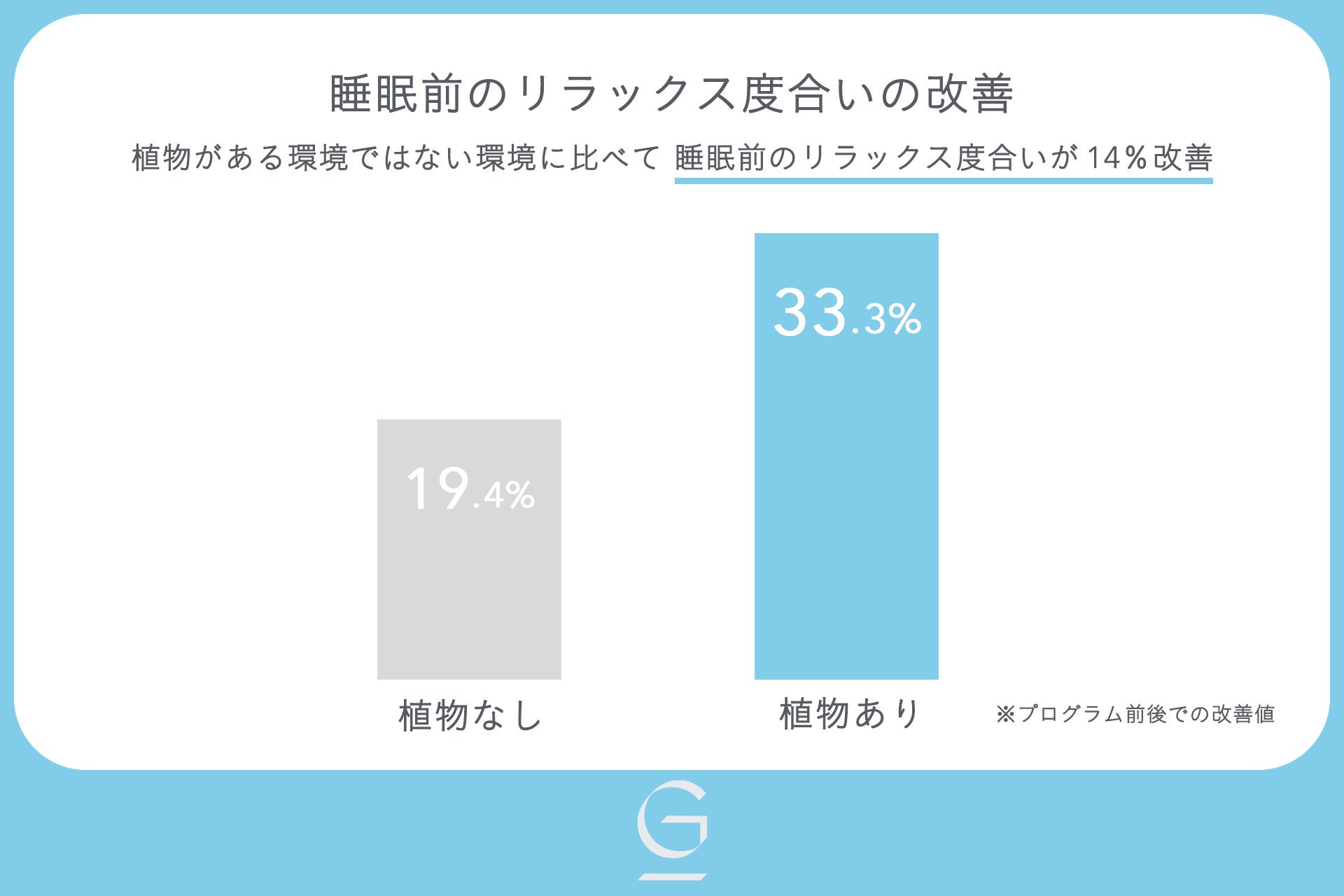 これは植物のない環境と比較して、睡眠の質で9%、睡眠前のリラックス度で14%の改善が見られる結果となりました。