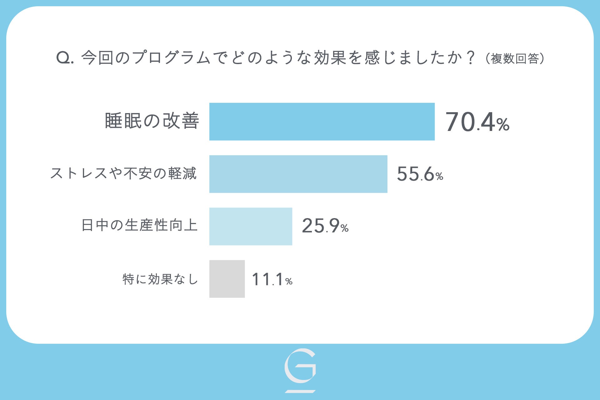 参加者全体では実証実験前後で睡眠の質は29%改善され、睡眠前のリラックス度は27%改善されました。また、普段の生活でのリラックス度合いも20%以上改善されており、集中力、心の安定度合い、レジリエンスにも10%以上の向上が見られました。