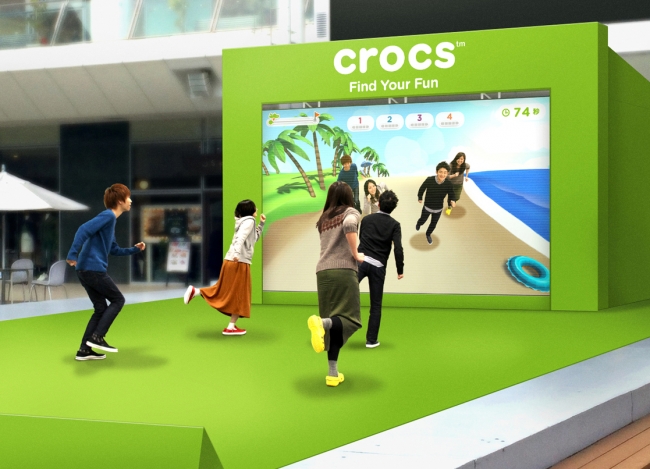 「撮れ~る!アドベンチャー」はクロックスシューズを履いて楽しむ最先端のアトラクションとして、イノベーティブなコンテンツ制作で知られる、株式会社猿人|ENJIN Inc.、株式会社カヤックの2社とタッグを組んで、本イベントのためだけに制作したオリジナルコンテンツです。独自に開発された最先端のフットデバイスが参加者の足踏みを感知し、目の前の大型ディスプレイにご自身の姿をほぼ等身大でリアルタイムに映し出します。走る速度で変化する「ビーチ」または「ジャングル」を背景に、突如登場する障害物を、皆で協力しながらジャンプやダッシュで回避していく体験型バーチャルアトラクションです。体験時の様子も写真で撮影されるため、まるで、ジャングルやビーチにいるようなユニークな写真を携帯にダウンロードいただけます。